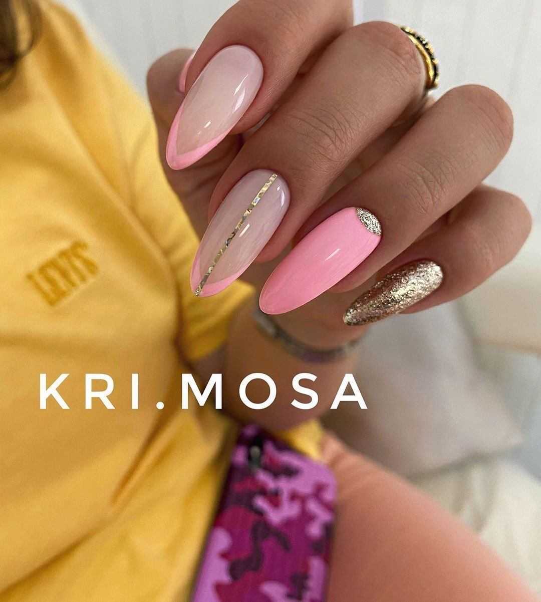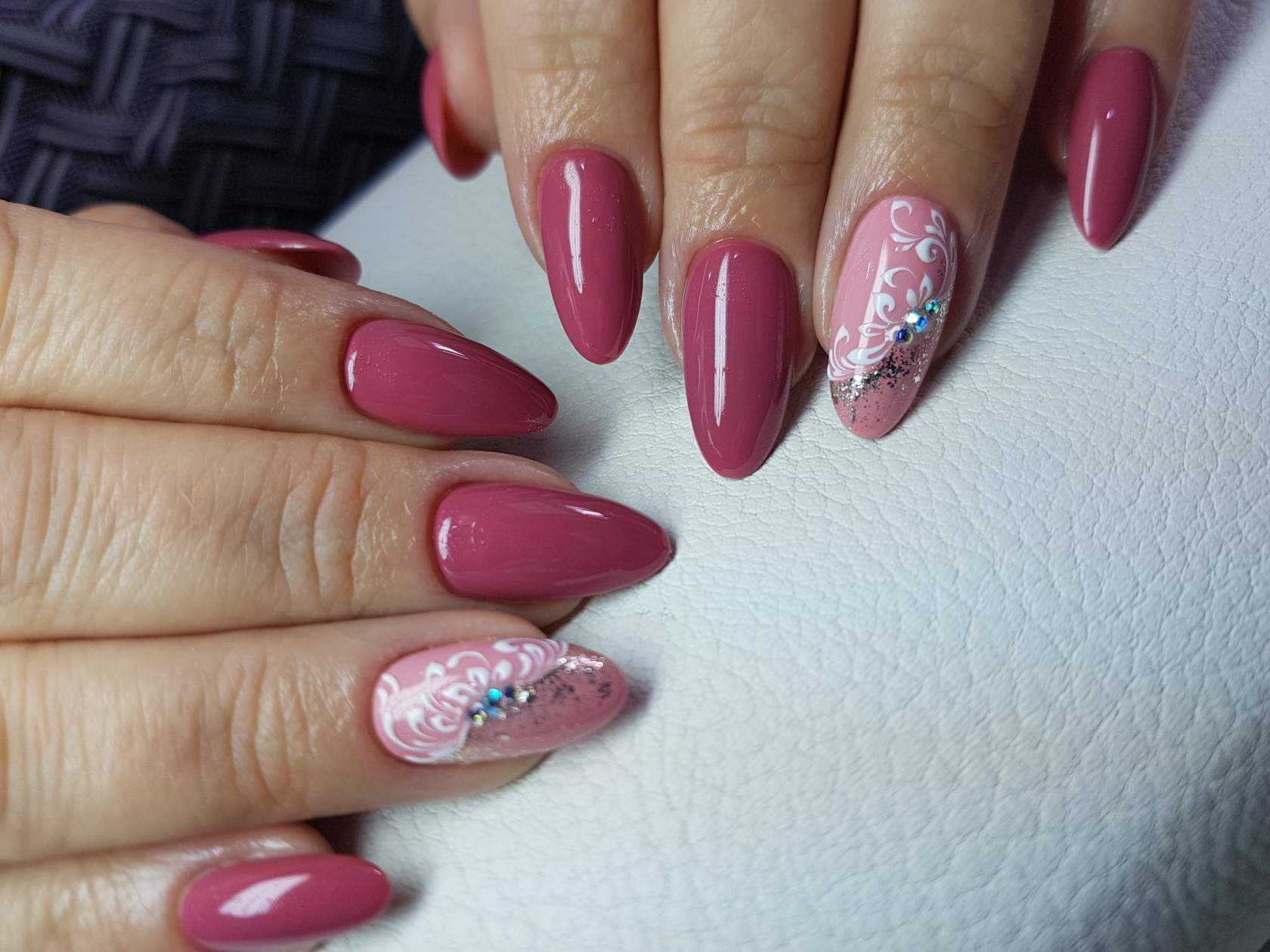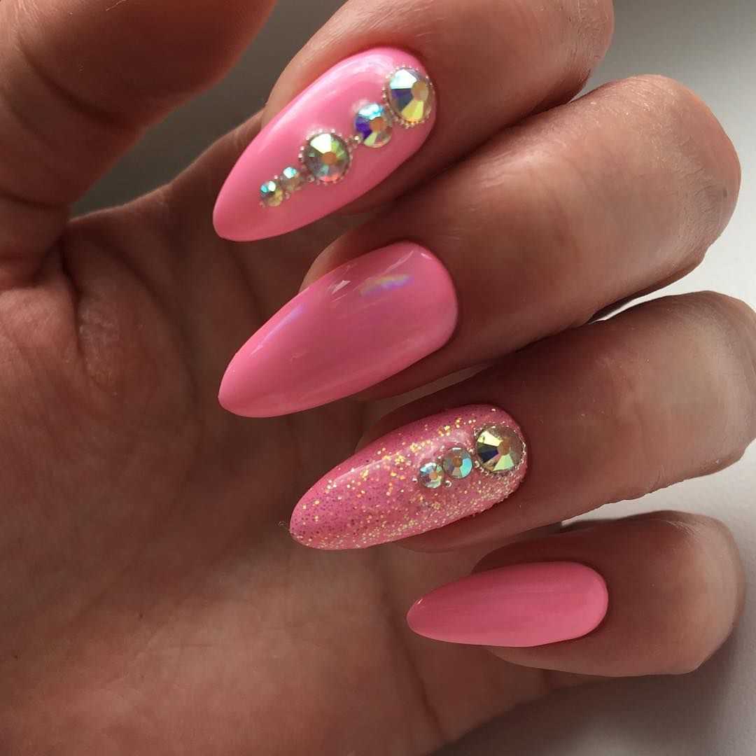 Всегда в моде розовый. Чрезвычайно женственный цвет в сочетании с миндальной формой придаёт очень свежий и нежный вид маникюру. Для более яркого эффекта можно использовать малиновый или арбузный тон.