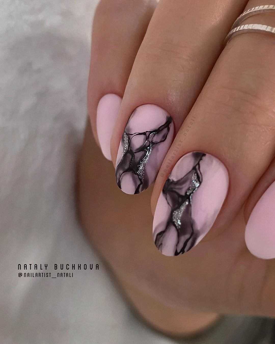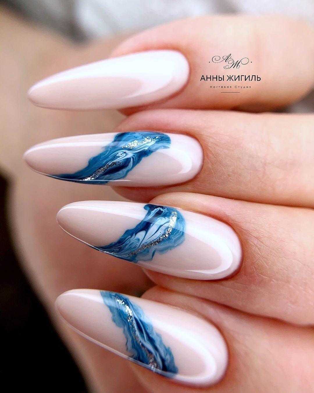 Мраморный дизайн прекрасно сочетается с заостренными ногтями и выглядит одинаково стильно в любых цветовых комбинациях.