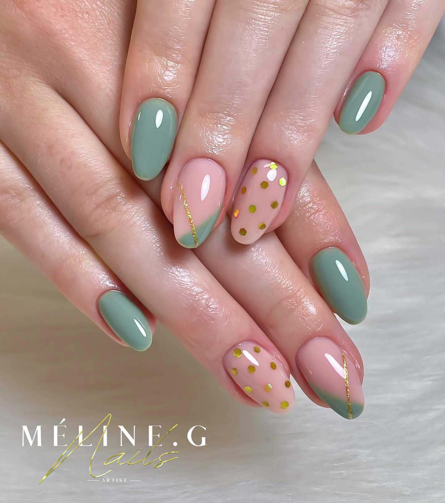 В данном случае мы рассмотрим маникюр, который будет выглядеть уместно с любым нарядом и макияжем. Итак, возьмите свой любимый мятный и белый цвет, а также перламутровую втирку с золотым напылением.