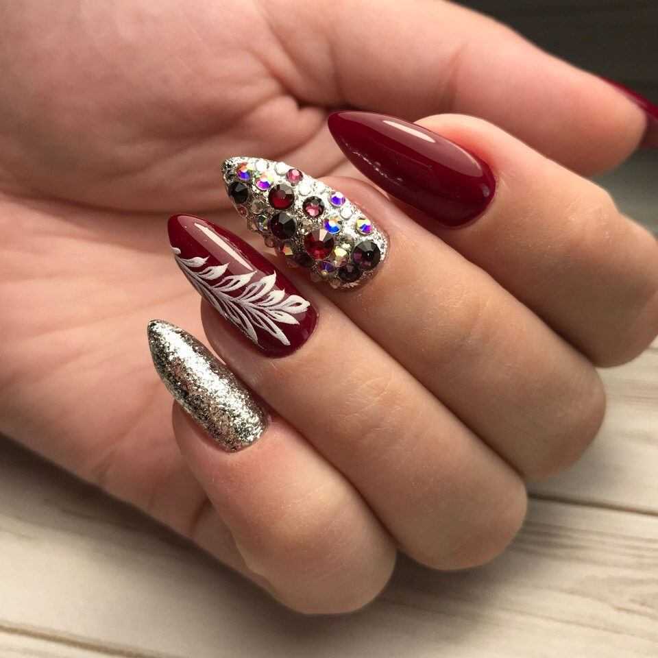 Но стоит заметить, что новогодний маникюр на миндаль обычно не делают полностью матовым. Чаще ногти выборочно перекрывают глянцем или добавляют ярких акцентов в виде стразов или блесток.