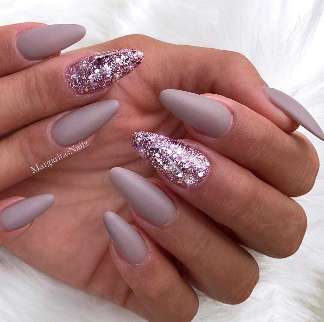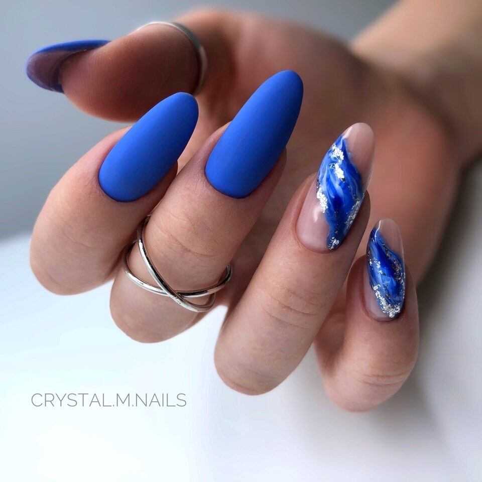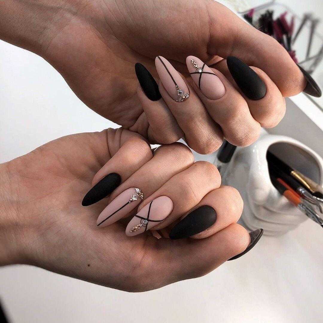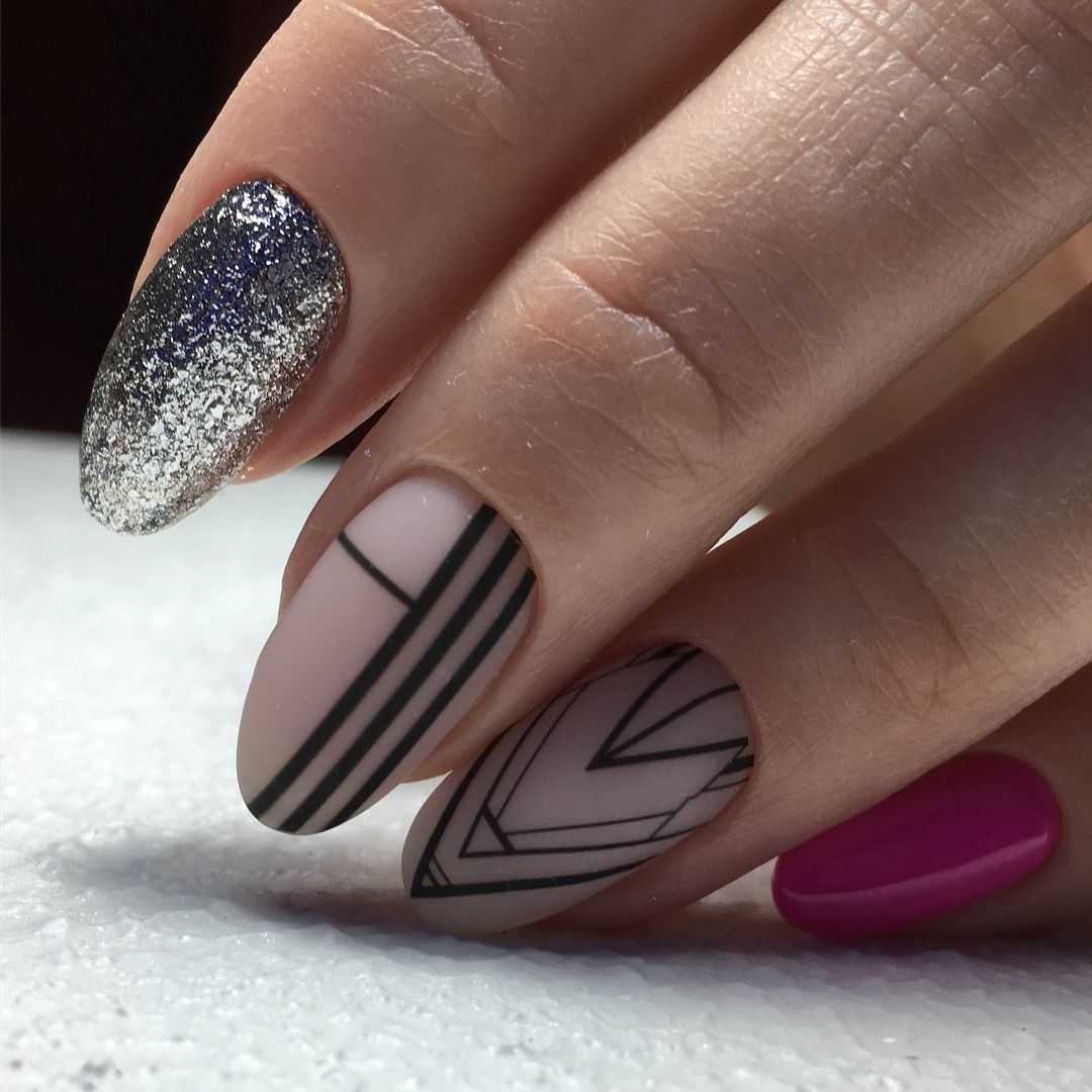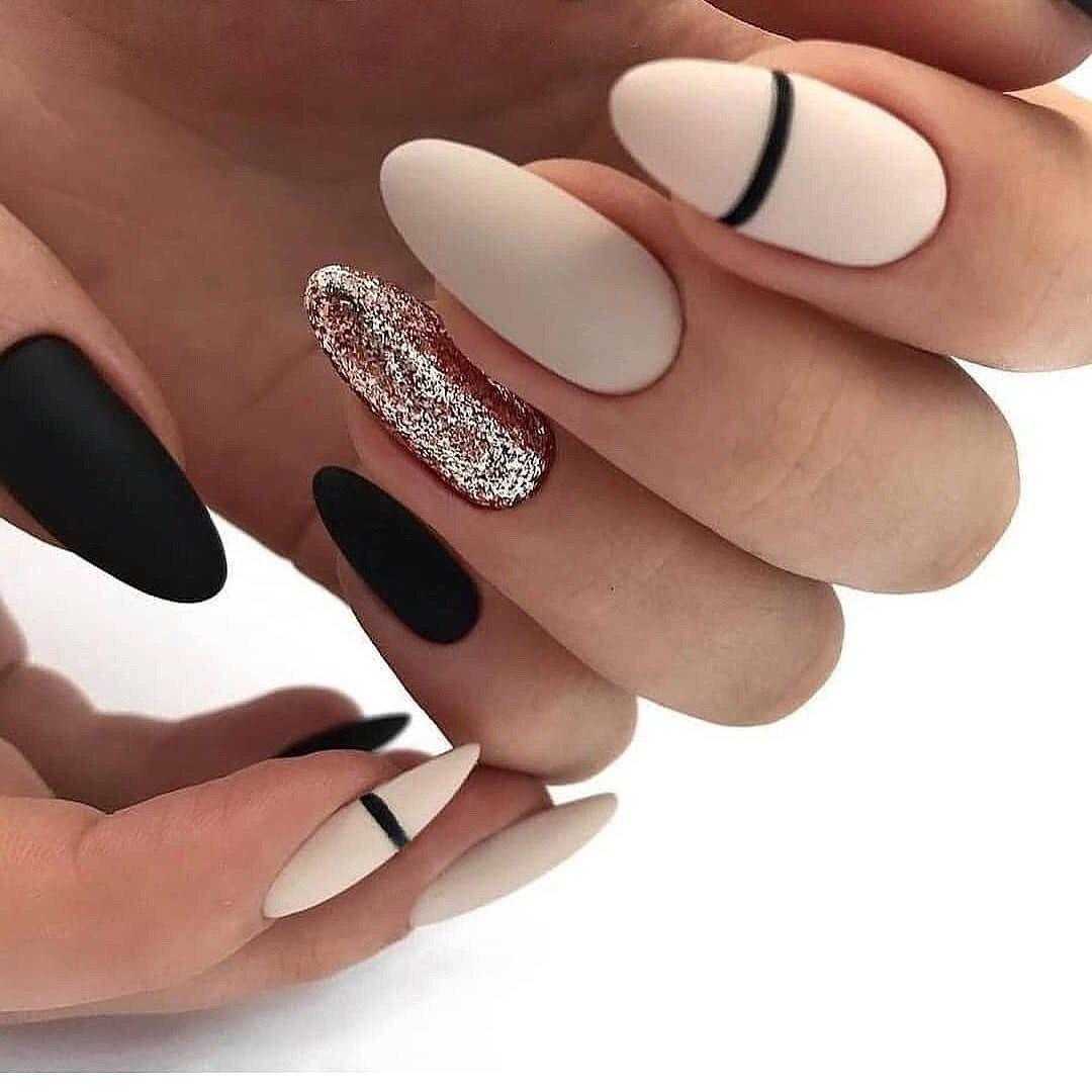 Наиболее простой способ придать миндальным ногтям современный вид — использовать матовый топ в маникюре. Покрытие может быть как сплошным, так и комбинированным. Именно дизайн с использованием различных фактур (глянцевой, матовой, зеркальной) — сейчас наиболее популярный. Сохраняется монохромность