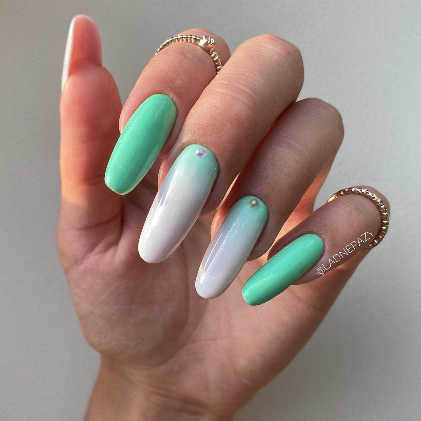 - Начиная с основания ногтевой пластины, воспользуйтесь мятным цветом, от середины и выше примитесь за белый цвет. Этот маникюр требует усидчивости и внимательности.