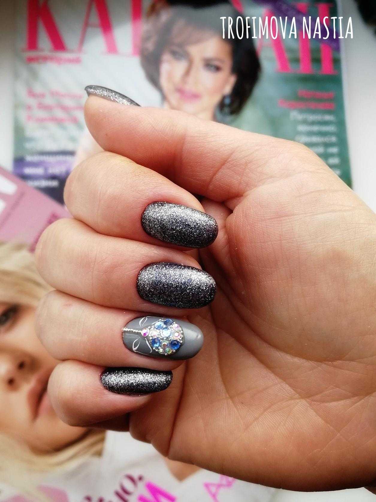 - Добавить изюминку этому дизайну поможет втирка, украсьте ею ноготь большого пальца, на этом маникюр можно читать завершенным.