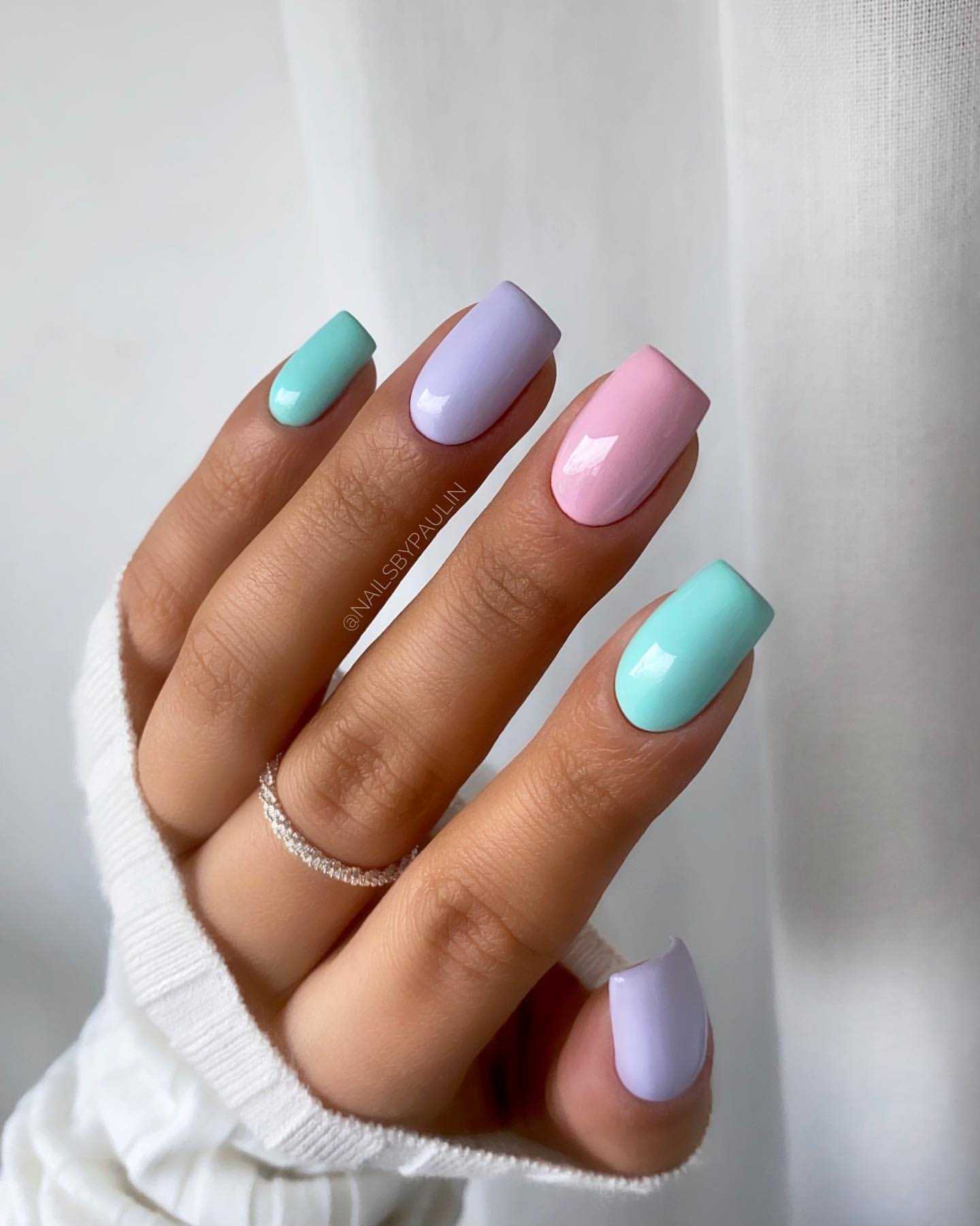 Но также возможен разноцветный матовый вариант. Подбираются близкие по тональности оттенки, на каждый палец наносится разный колер.