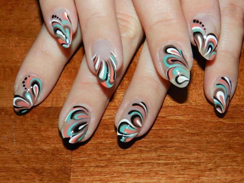 Для создания такого дизайна вам понадобится губка. Сначала ногти покройте синим, бирюзовым и светло-коричневым. Затем эти же цвета нанесите на кусочек губки и аккуратно прислоните ее к ногтевой пластине.
