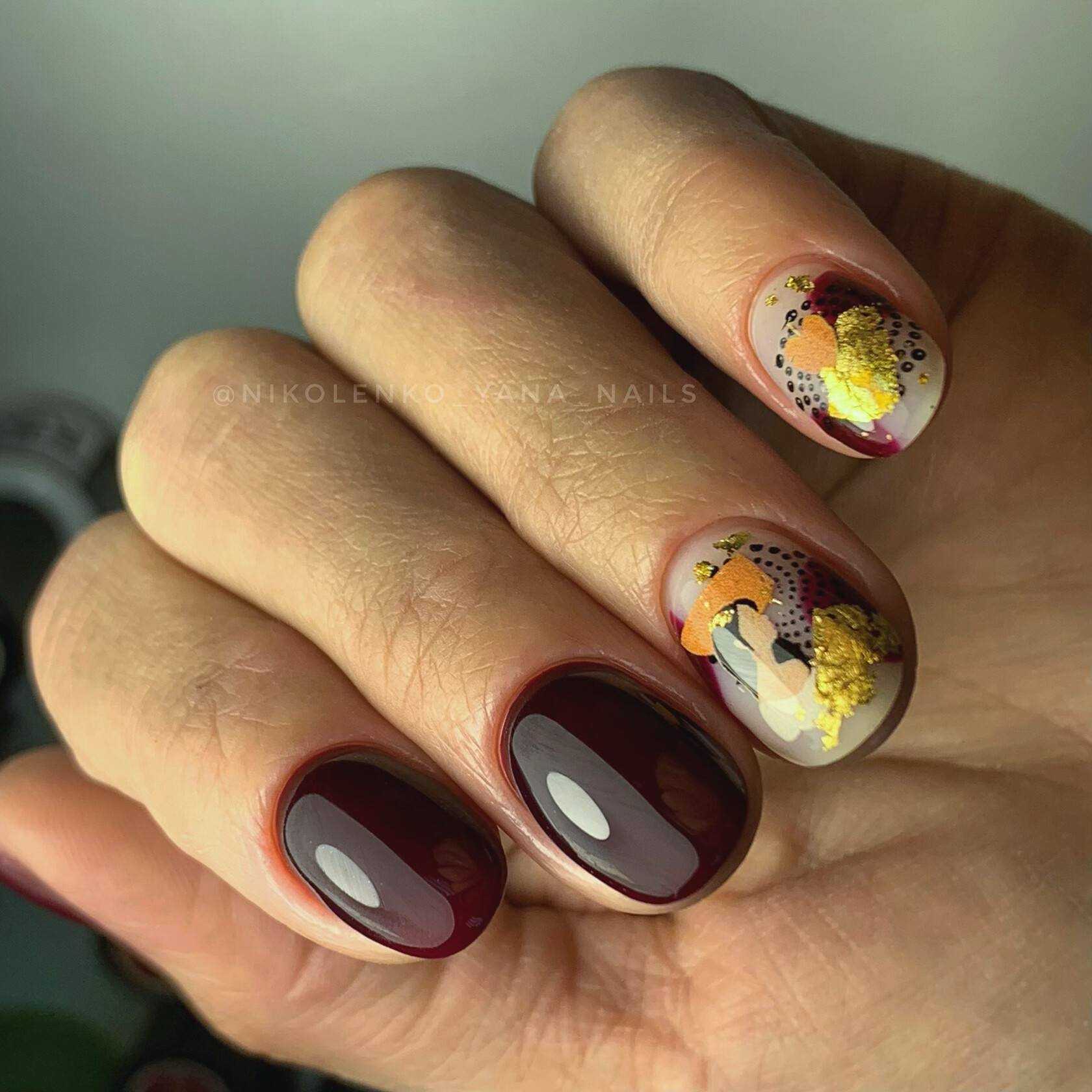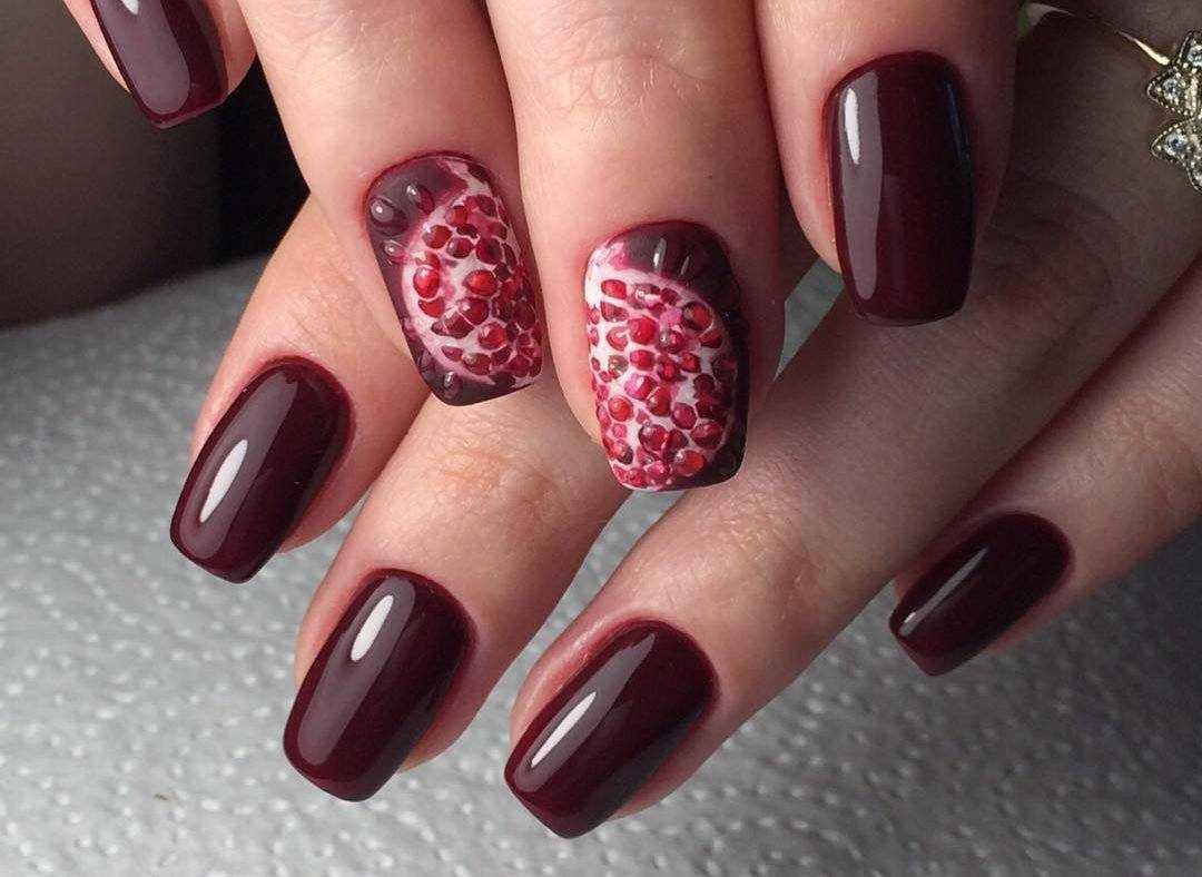 Мастера нейл-арта очень любят эту тему: они рисуют на бордовом фоне абстракцию, силуэтные изображения, цветочные мотивы. Если наскучил минимализм, можно стать на сторону геометрии — квадраты, треугольники, овалы и полоски. Очень эффектно на ярком фоне будут смотреться рисунки, выполненные в технике акварель, а также изображения из фольги.