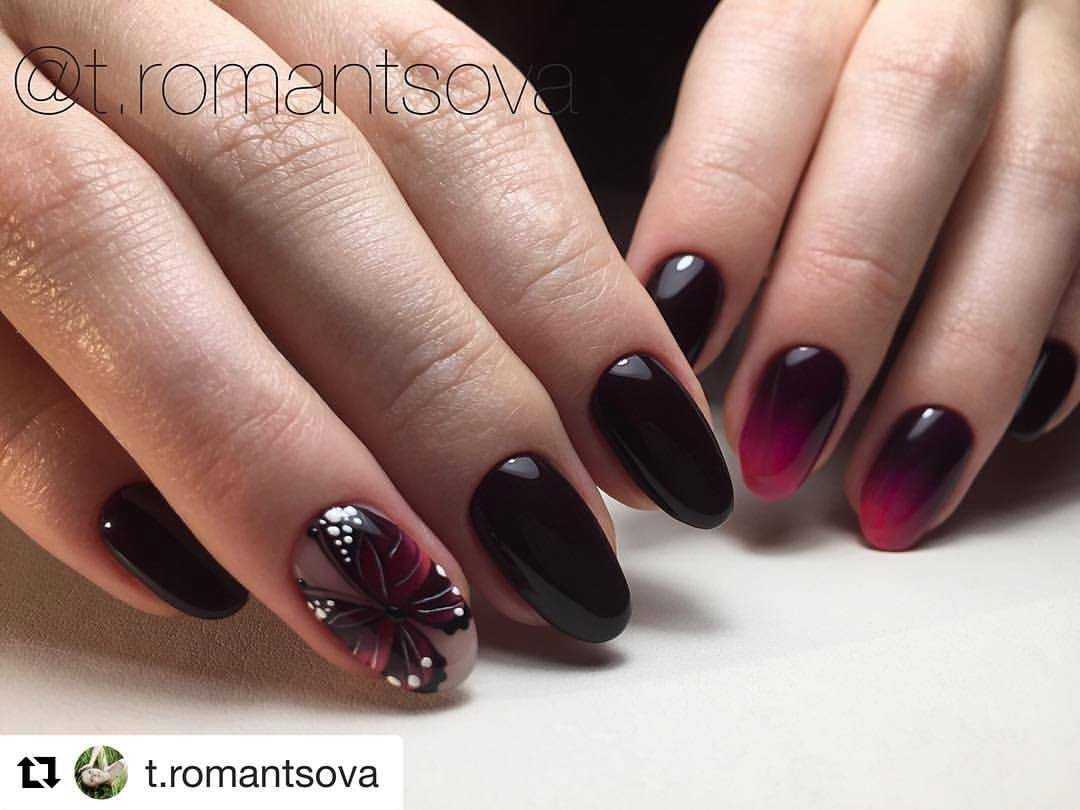 Эффектно смотрится градиент на ногтях, если одним из используемых оттенков будет бордовый. Он прекрасно сочетается со всеми оттенками красного, а также со всей гаммой пастельных тонов. Суть техники в создании плавного перехода от темно-бордового к самому светлому оттенку. Кроме этого на ногтях можно создавать всевозможные рисунки с использованием бордового цвета, сочетать между собой контрастные оттенки или те, которые лишь слегка отличаются от бордового. Проще всего нанести бордовый лак на всю ногтевую пластину и наслаждаться неповторимым эффектом от глубокого цвета. Самый популярный глянцевый вариант можно чередовать с матовым. Также интересно выглядят комбинации с черным лаком. Такой маникюр смотрится загадочно и изыскано и подходит для любого дресс-кода.
