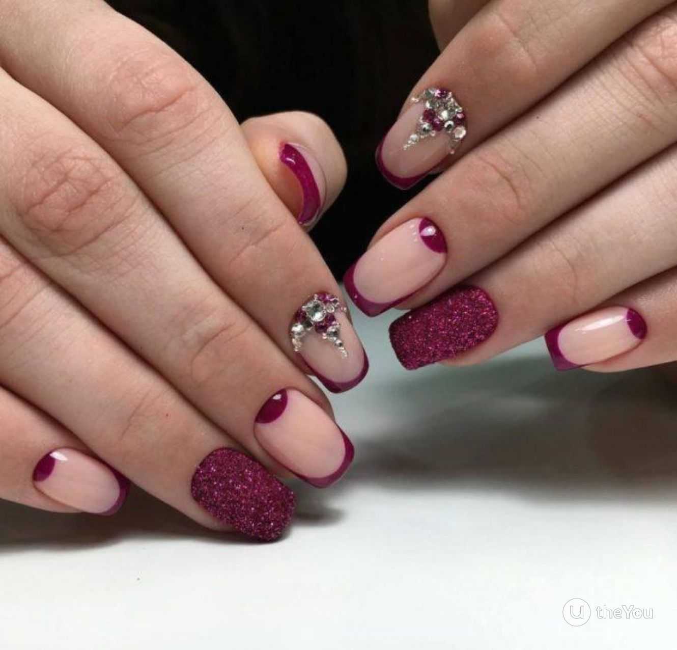 Французский. В этом маникюре темно-красный цвет наносится на верхнюю часть ногтя, а остальная часть может быть украшена, например, стразами.