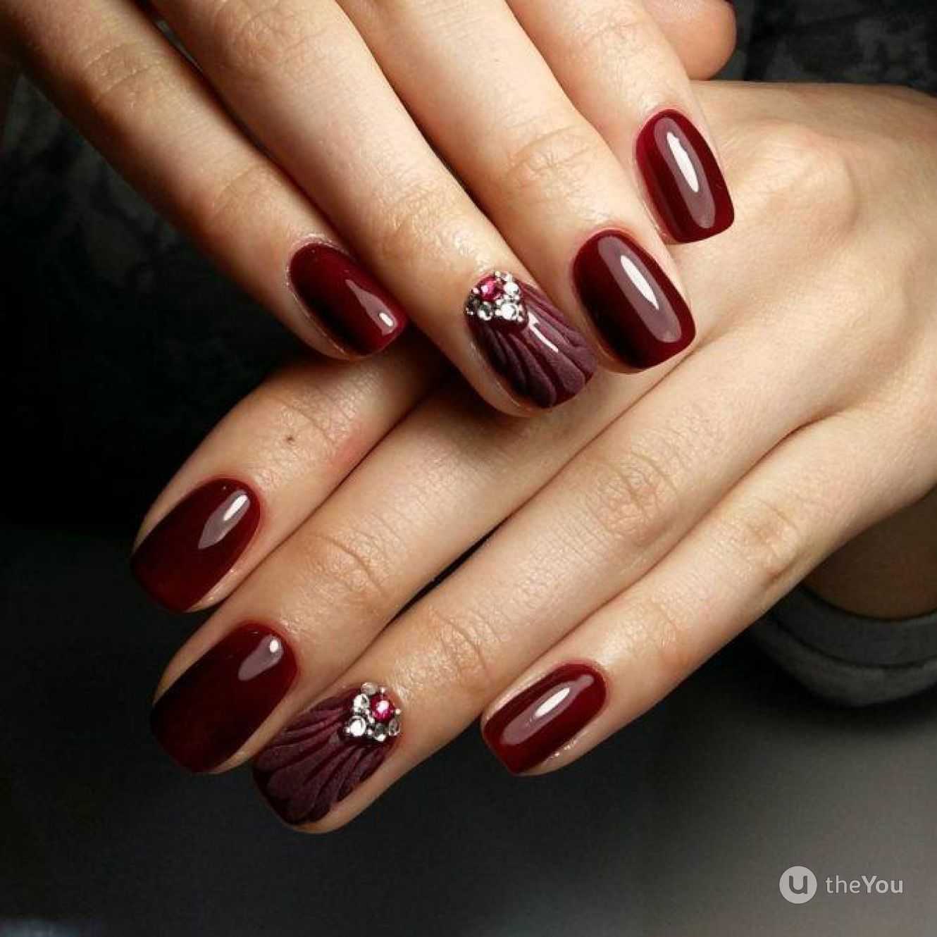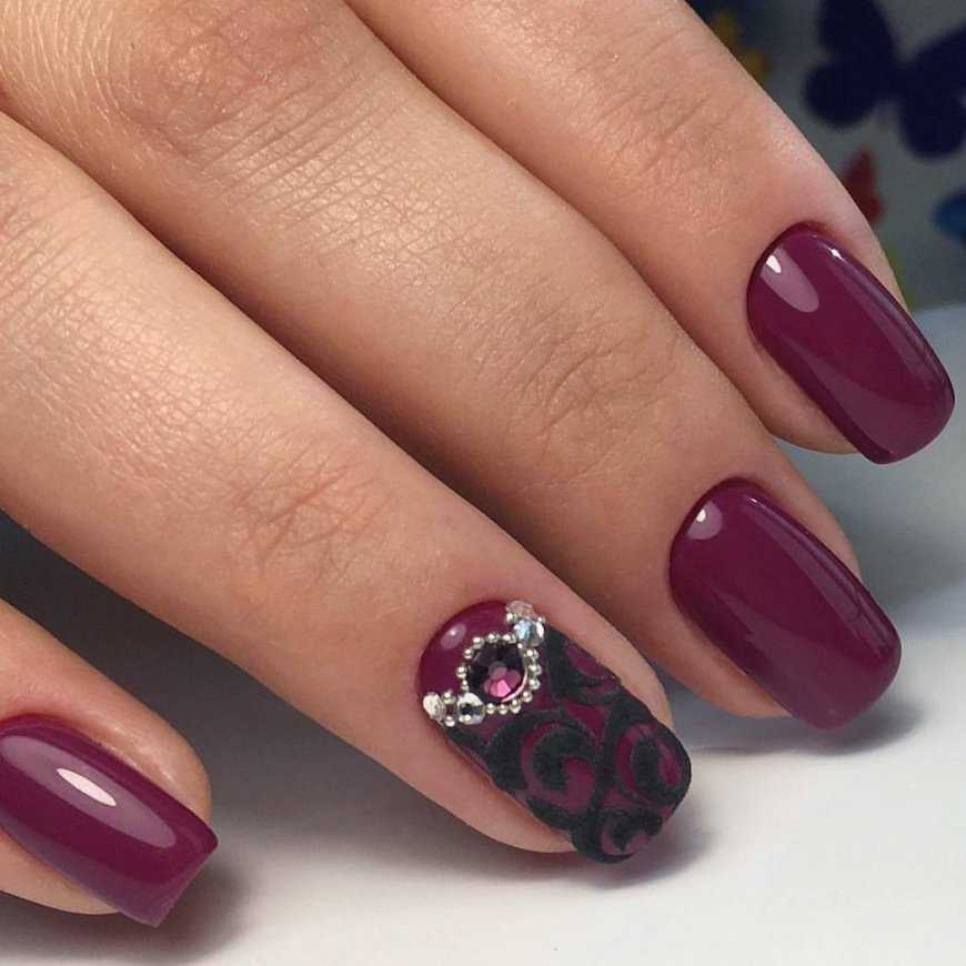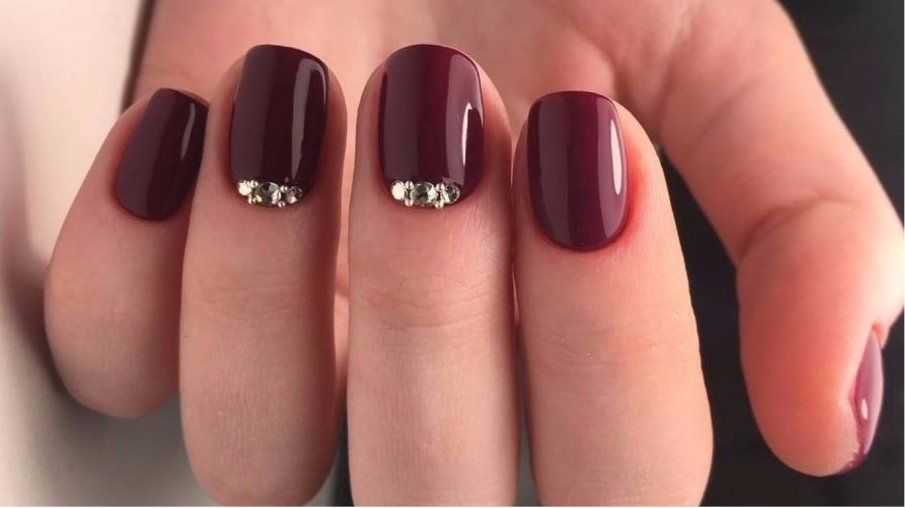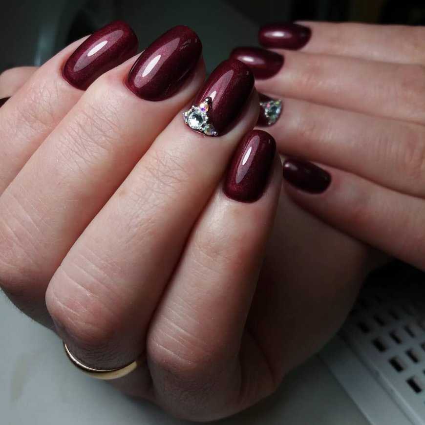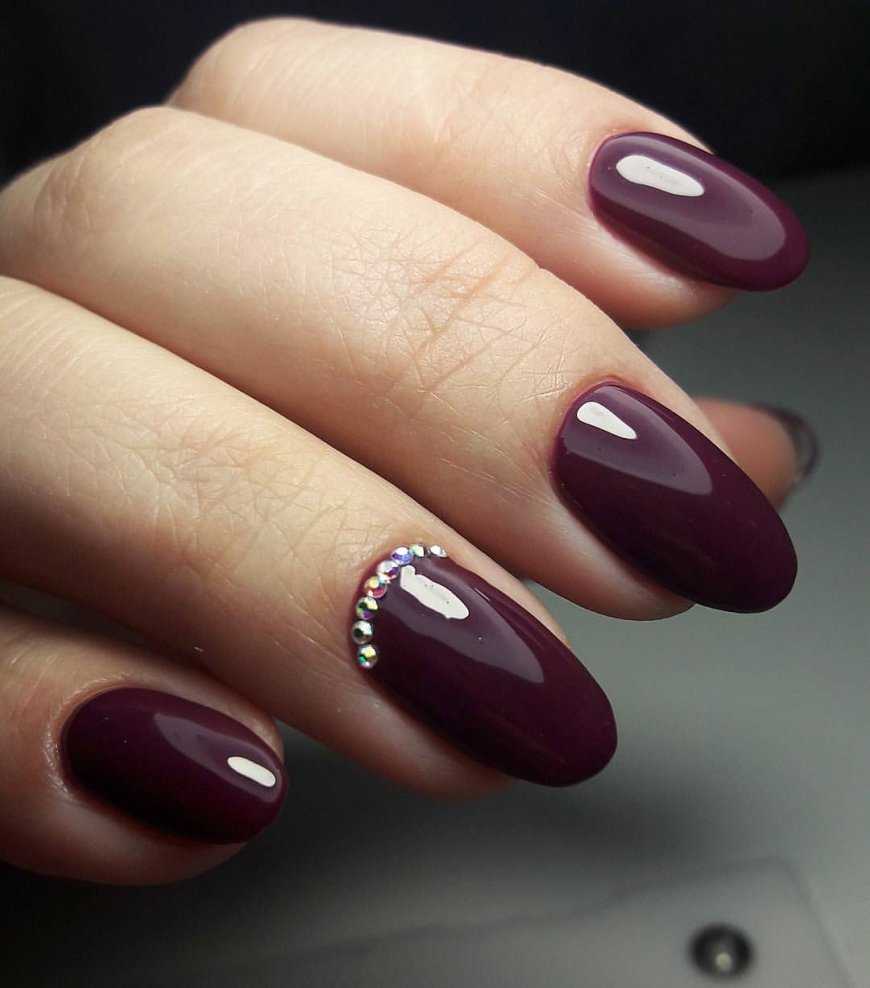 Со стразами. Камешки или стразы послужат богатым украшением для вашего маникюра: с помощью кристаллов собрать определенную форму или хаотично разместить их на поверхности ногтей. Ваша фантазия безгранична, вы можете создать свой собственный уникальный стиль; винный оттенок добавляет нотку роскоши.