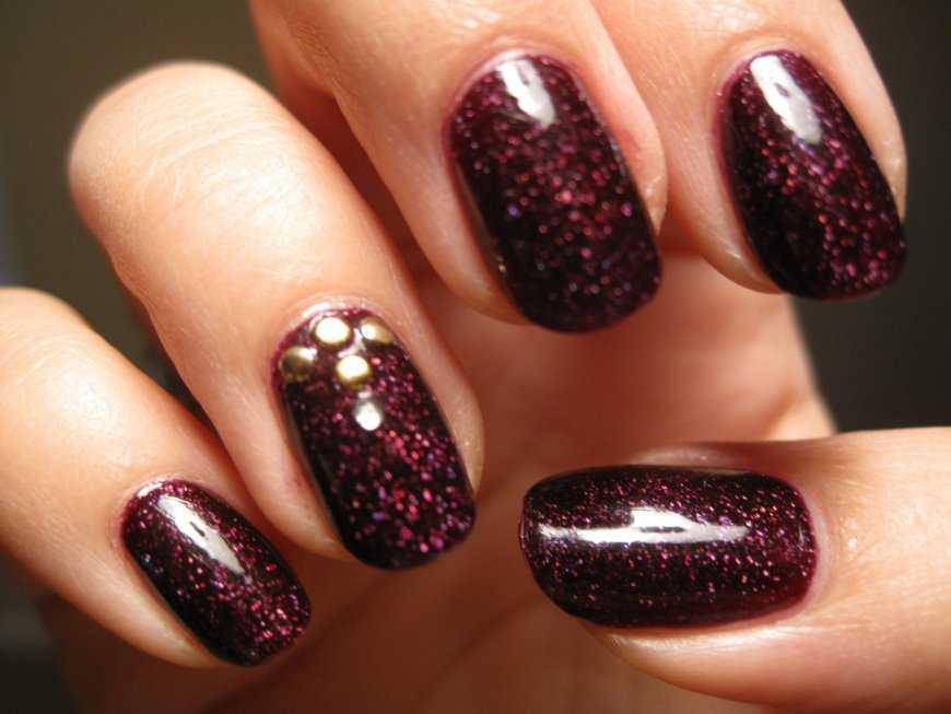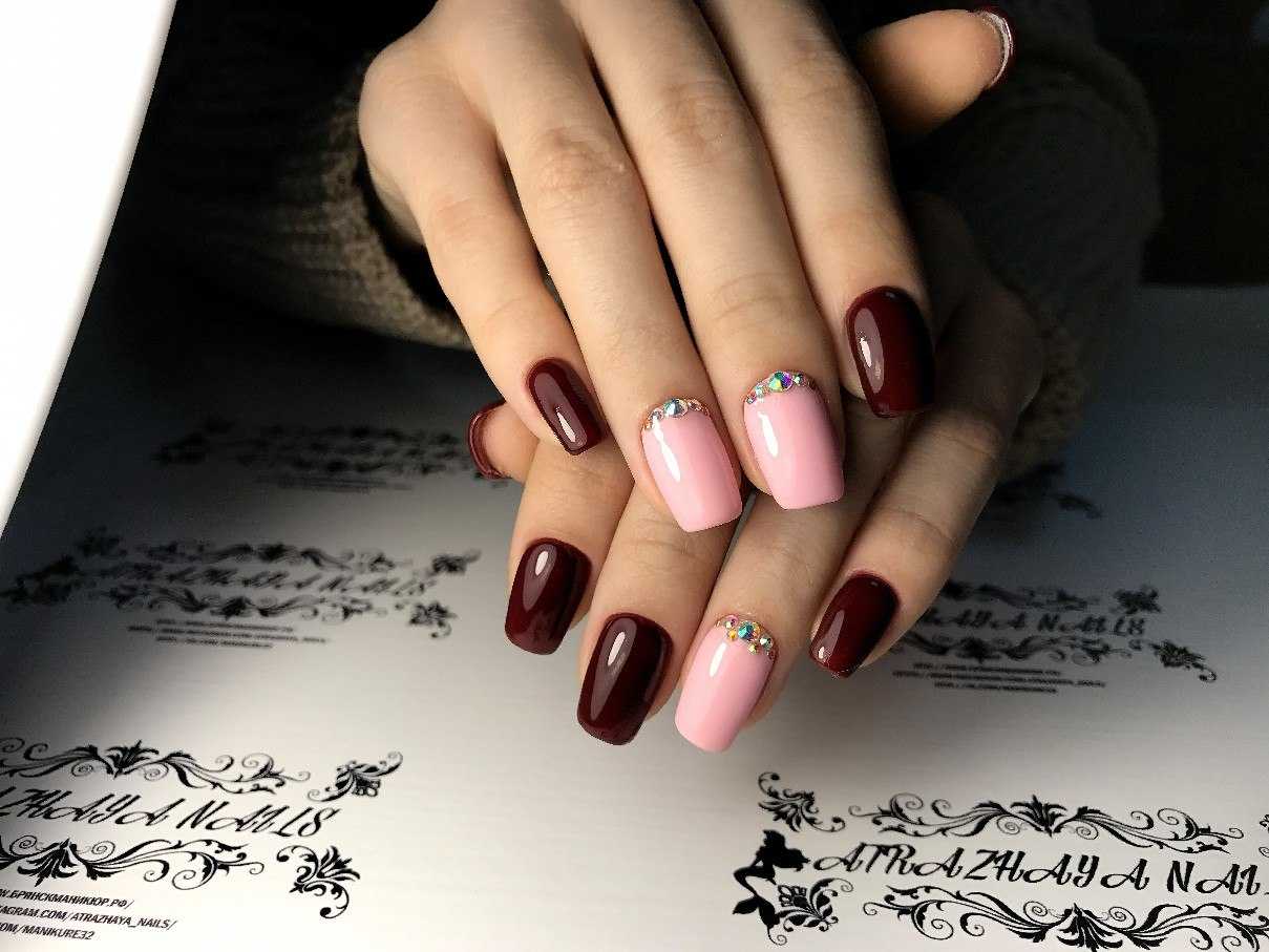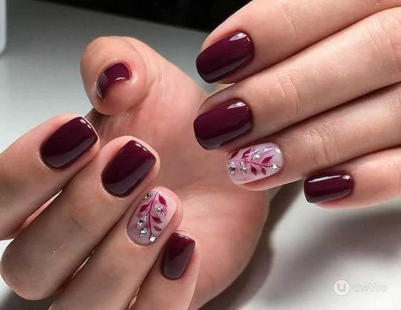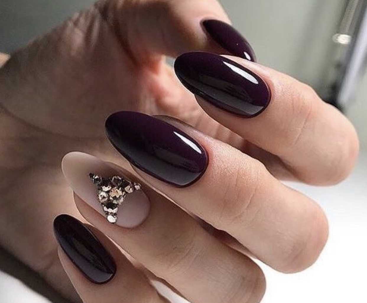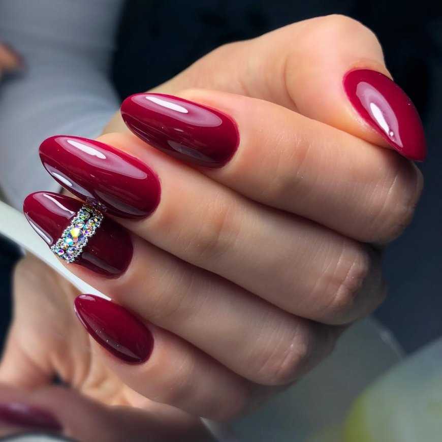 Со стразами. Камешки или стразы послужат богатым украшением для вашего маникюра: с помощью кристаллов собрать определенную форму или хаотично разместить их на поверхности ногтей. Ваша фантазия безгранична, вы можете создать свой собственный уникальный стиль; винный оттенок добавляет нотку роскоши.