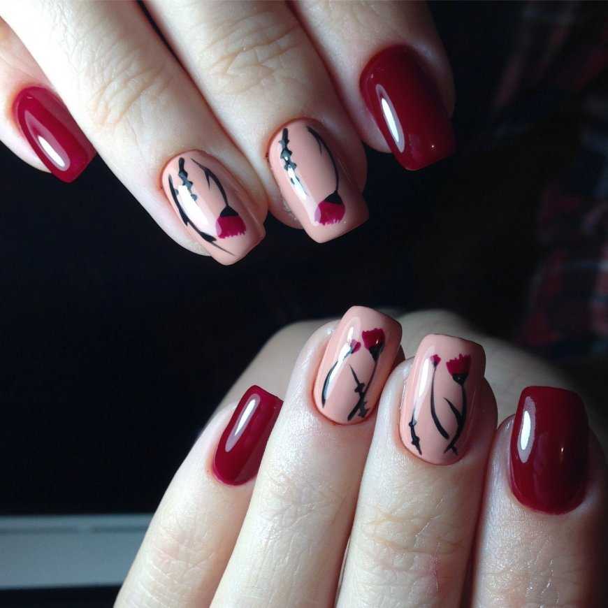 Классический бордовый маникюр, дополненный нежными цветочными рисунками, обеспечит нежное и романтическое настроение. В данном маникюре большую роль играет сам стиль выполнения цветов на бордовой основе. К примеру, большие розы придадут нейл-арту изящности и женственности. Данное решение станет хорошим выбором для вечернего лука. Лаконичные бутоны и скромные цветы сделают маникюр более сдержанным. Этот дизайн можно смело использовать для повседневных образов. При желании рисунки можно украсить блестками, стразами или бусинками. Чаще всего девушки выполняют французский маникюр на всех ноготках, кроме безымянного пальчика, который покрывают бордовым цветом полностью и выполняют цветочные рисунки контрастным цветом.