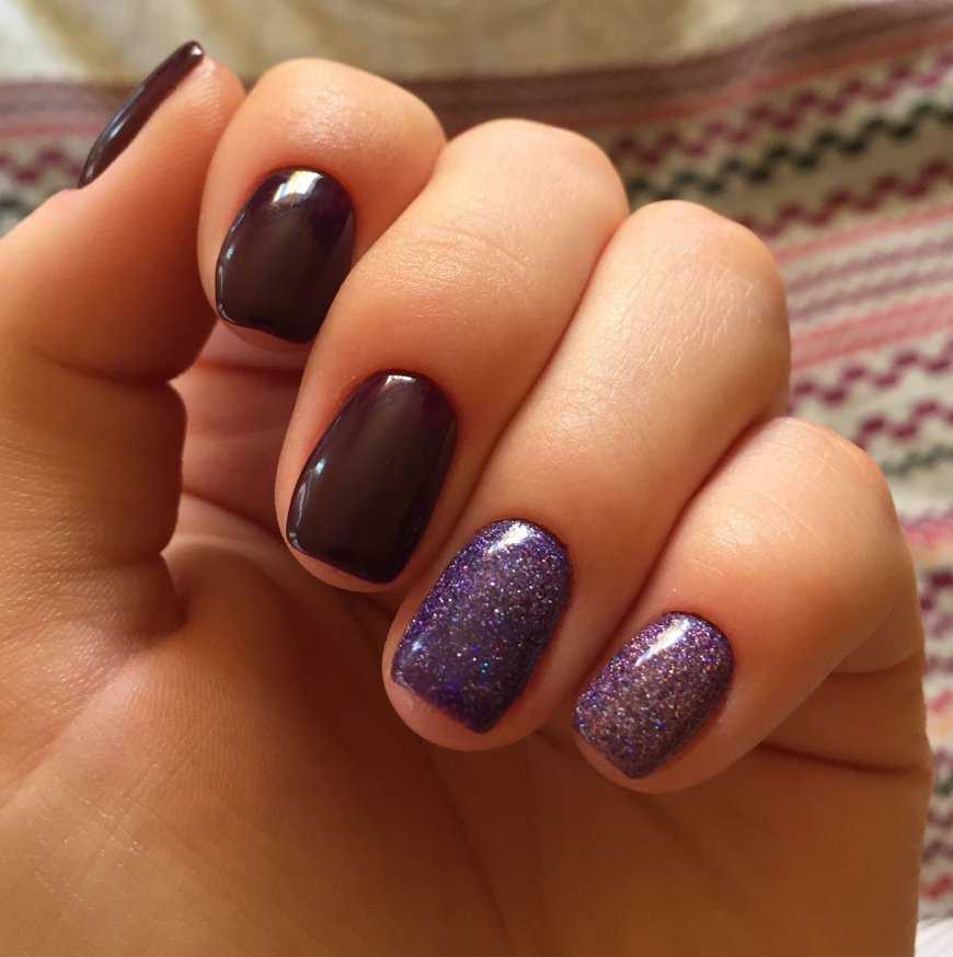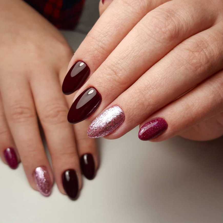 Блеск по-прежнему в моде. И бордовый маникюр с его помощью можно легко разнообразить. Выбирайте шиммерные оттенки лака или сочетайте классическое глянцевое покрытие с песочными блестящими топерами. Не забывайте про втирки, которые придают красивое переливание.