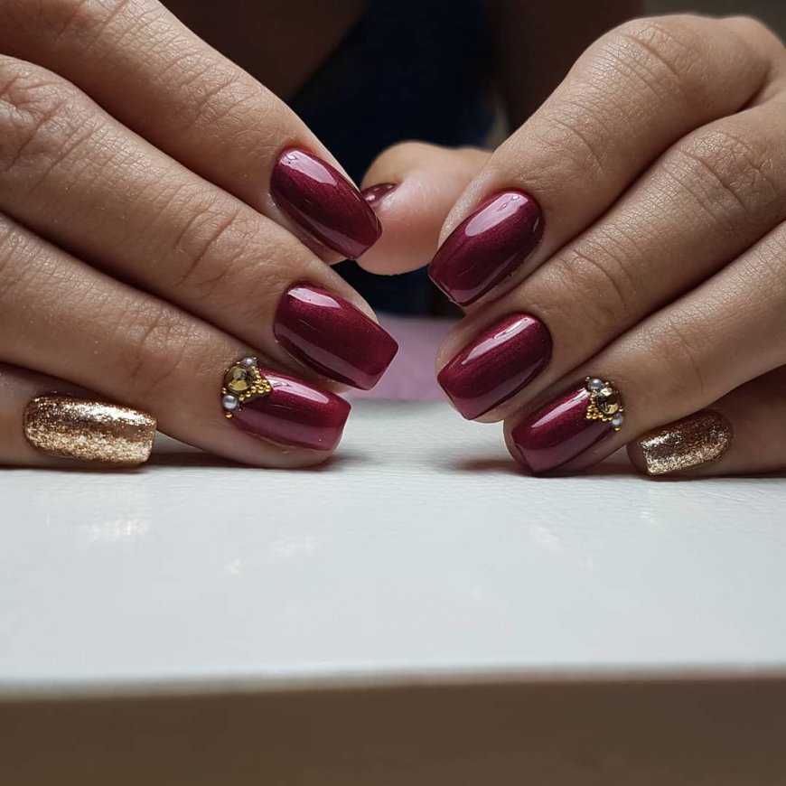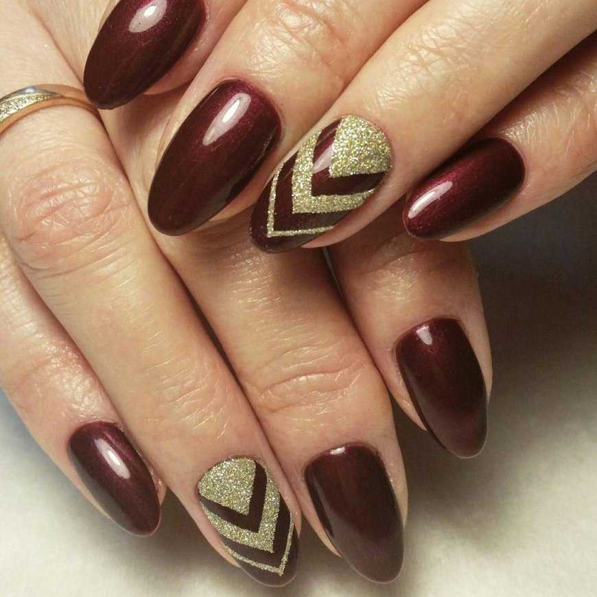 Золотистые акценты на ногтевых пластинах с бордовым лаком вызывают абсолютно противоположные чувства, если сравнивать с предыдущим предложением, ведь сияние золота – это всегда страсть и буря эмоций. Следовательно, подобное решение больше подходит барышням, предпочитающим тёплую гамму оттенков. Как и в случае с серебром, золотистые блёстки очень красиво смотрятся на кончике и у основания ногтевой пластины, могут украшать ноготок полностью или использоваться для нанесения узоров. В этом случае каких-то особых правил и техник не существует. Главное отличие – настроение, которое создаётся при помощи блестящих деталей и визуальное восприятие драгоценного сияния.