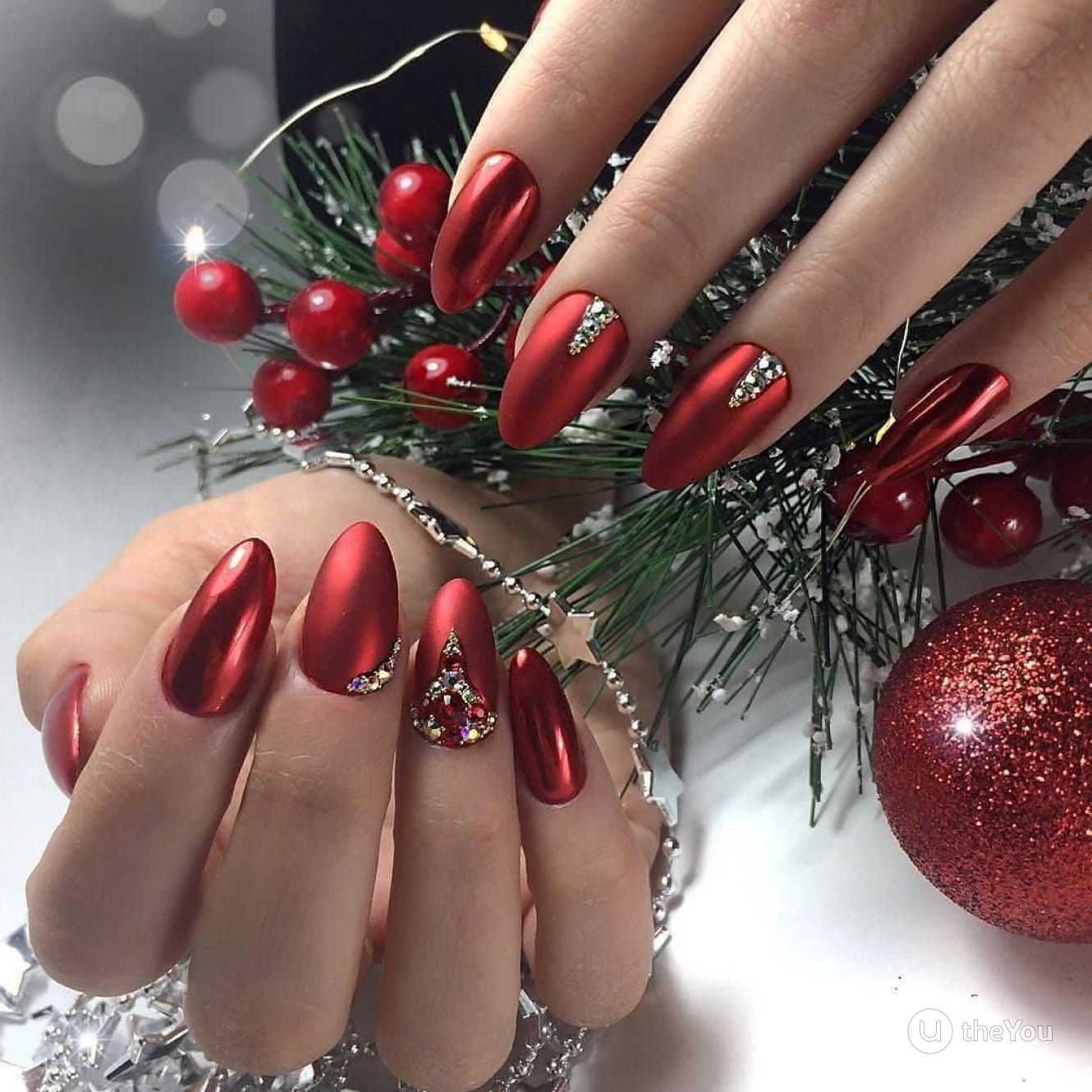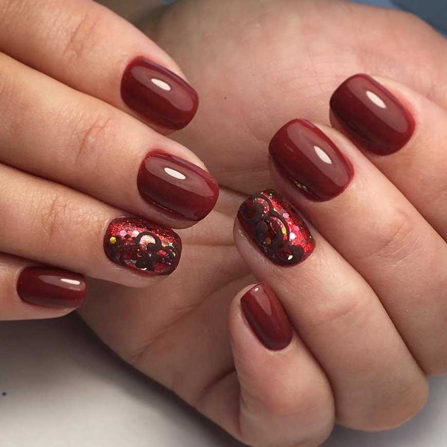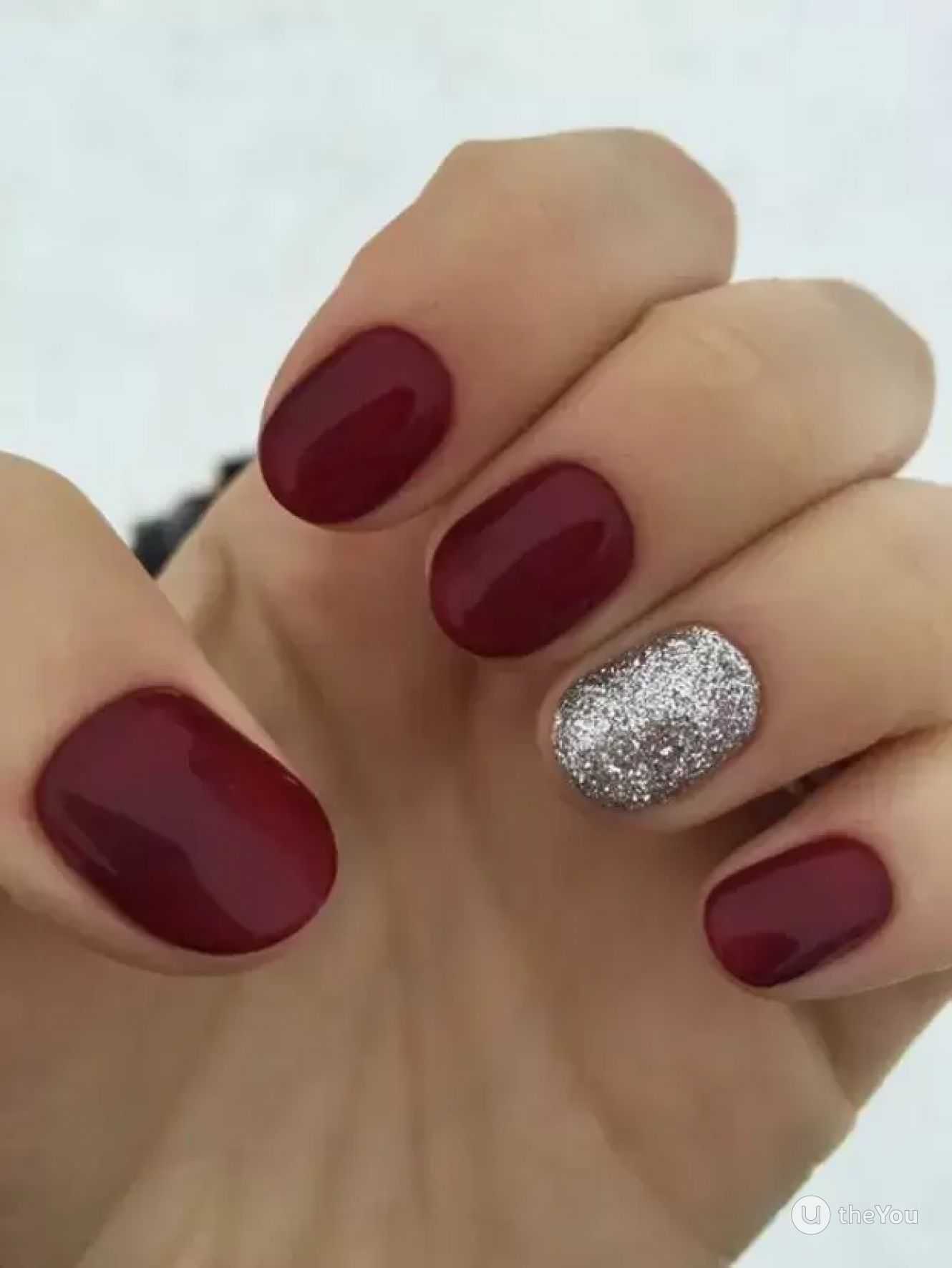 Тематика новогодних праздников отлично будет сочетаться с выбором бордового цвета маникюра. Праздничного настроения добавят симпатичные наклейки для ногтей, глиттер, фольга, роспись, мелкие стразы и пр. Новогодний маникюр отлично будет смотреться как на матовом лаке, так и на глянце.