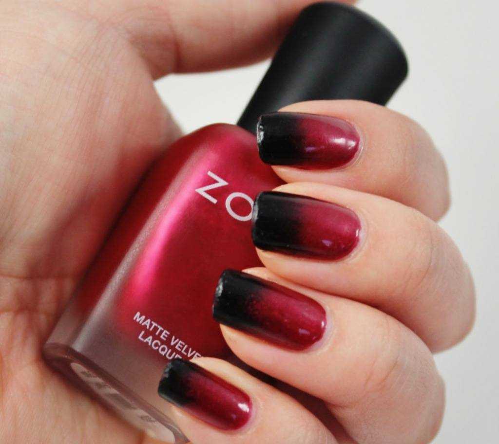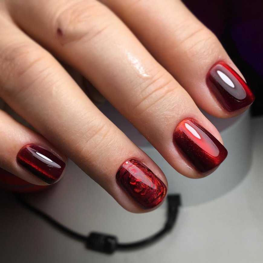 - Техника омбре перекочевала с волос на ногти. Все оттенки красного, включая винный и бордовый можно расположить на одном ногте. Другой вид окрашивания предполагает цветные переливы, переходящие от ногтя к ногтю.