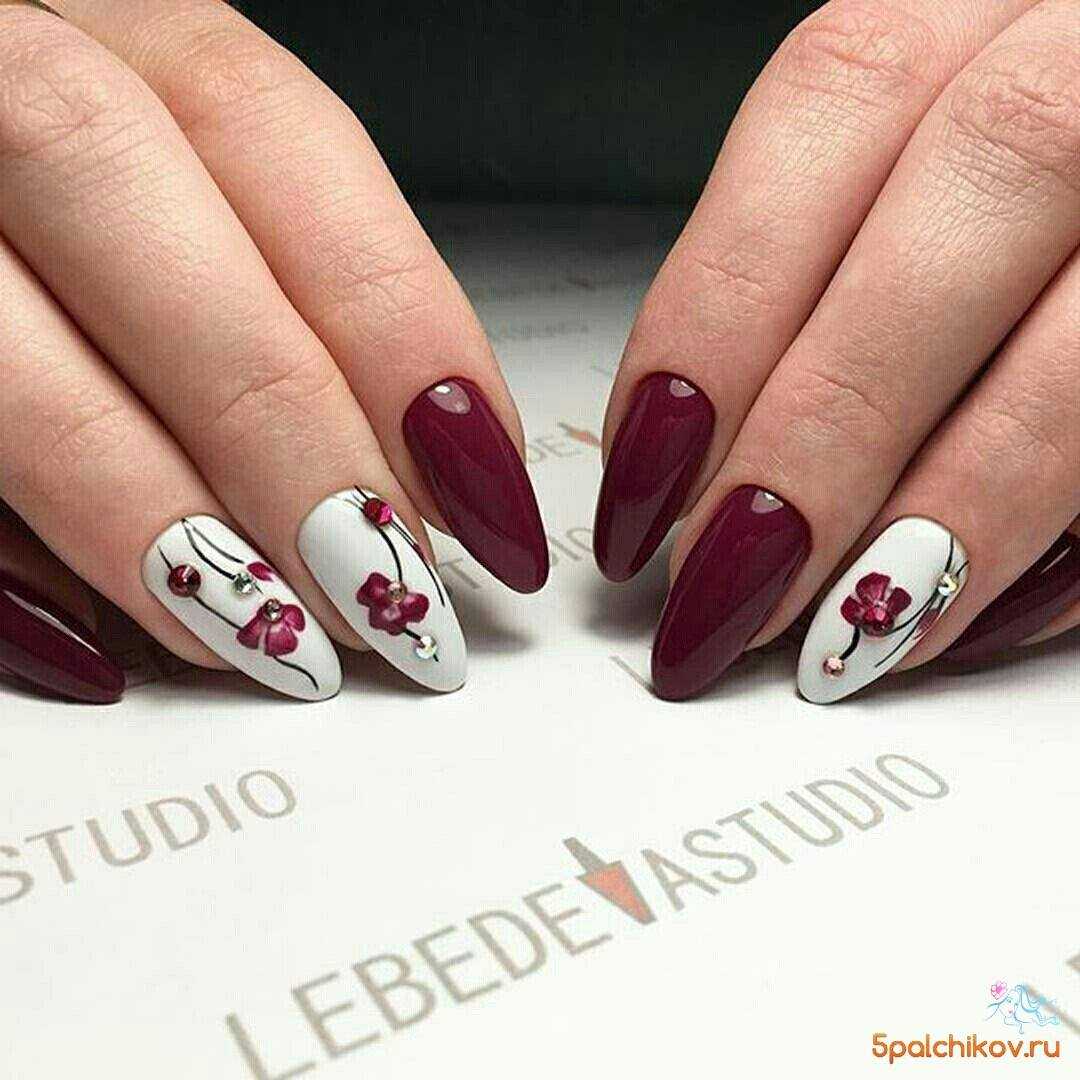 При этом не важно, как будут расположены рисунки: на нескольких ноготках или же на каждом пальчике. Еще один прекрасный вариант – покрыть все ноготки бордовым цветом, а один оставить прозрачным и выполнить на нем утонченную цветочную композицию из объемных цветов белого цвета
