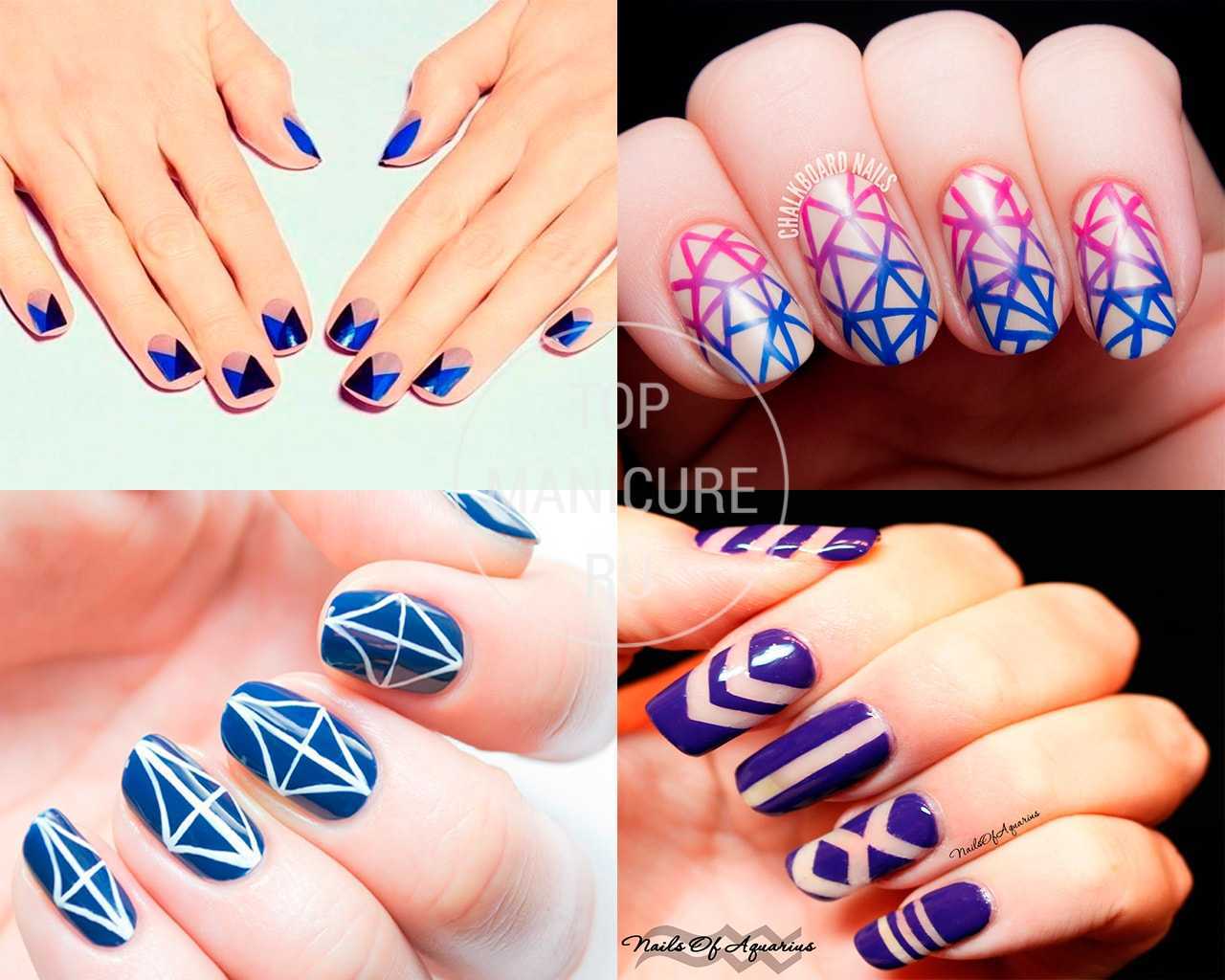 Фото 4. Для создания такого геометрического орнамента используются трафареты. Их можно вырезать из липкой бумажной ленты. Наклеиваем трафареты, красим ногти в синий цвет, убираем трафареты и наслаждаемся!