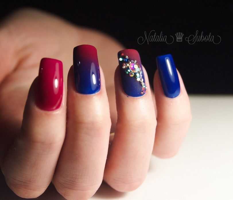 Дерзкий и яркий красно-синий маникюр — то, что нужно для смелых девушек. Игра текстур с акриловой пудрой или бархатным песком дает возможность немного приглушить цвет. Укрась ногти декором оттенка металлик, чтобы дополнительно подчеркнуть цветовую композицию