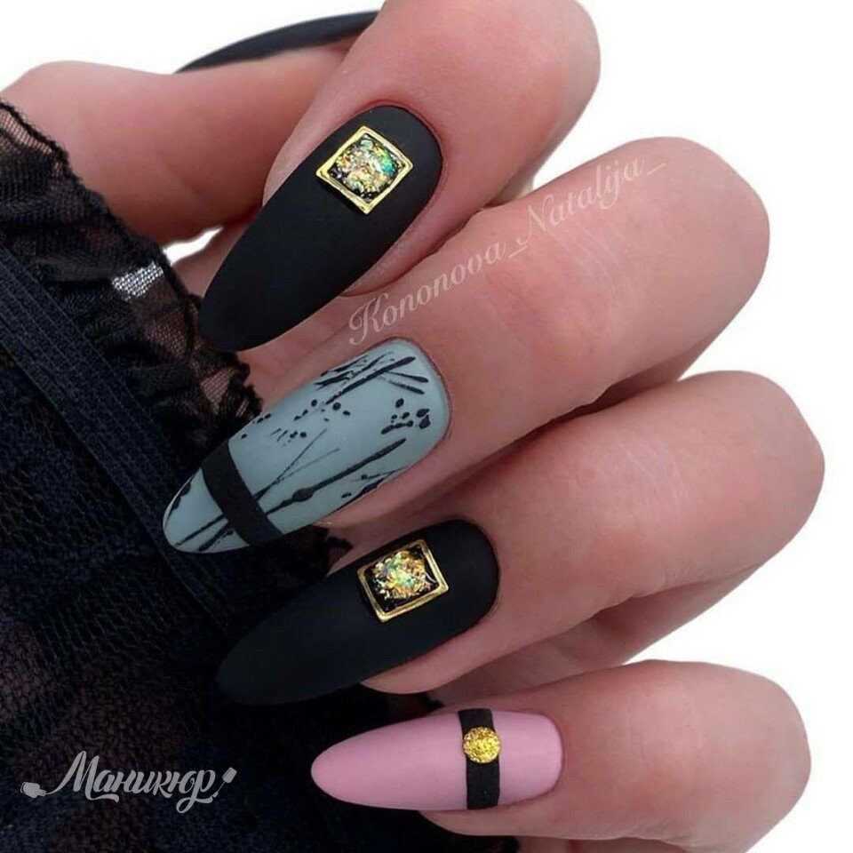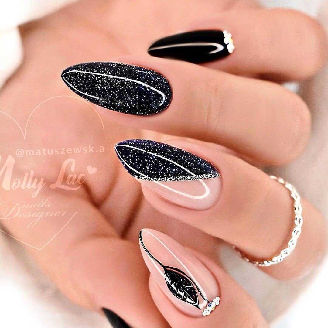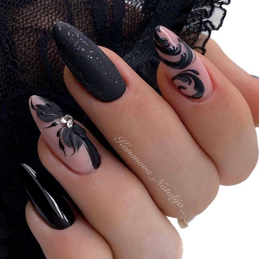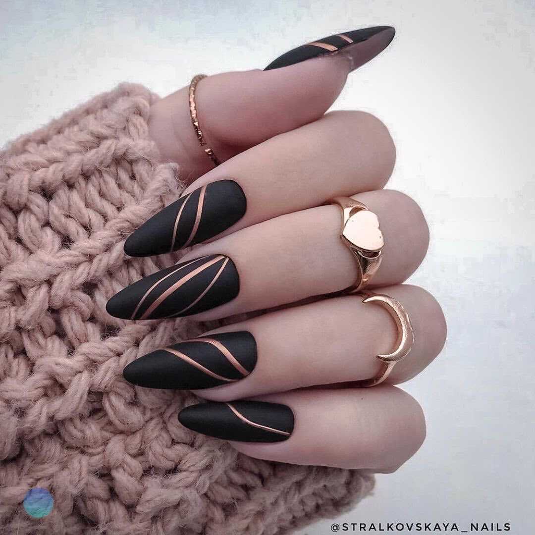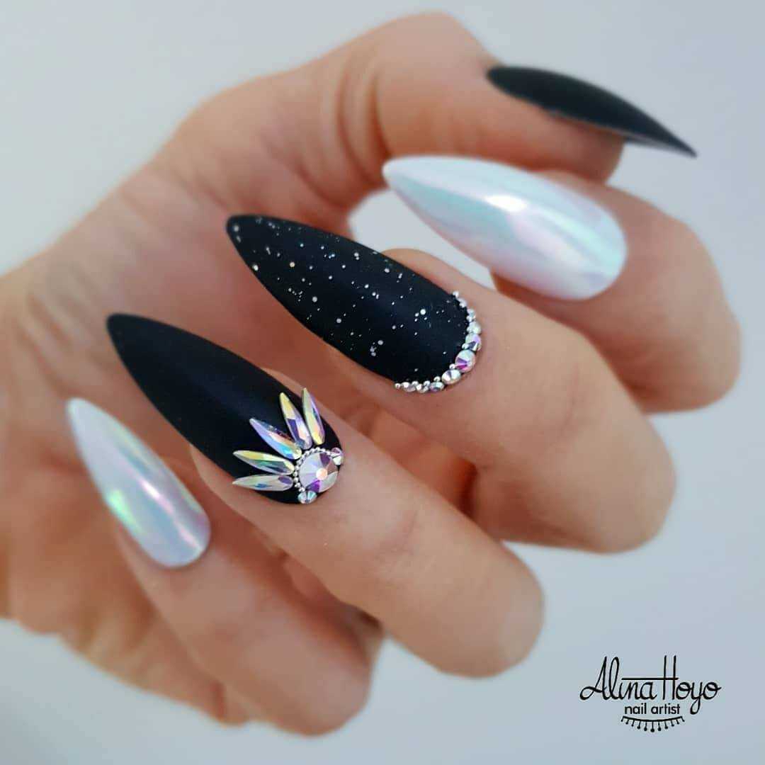 В наши дни уже никто не сторонится чёрного лака, поскольку его завораживающая глубина невероятно красиво смотрится в различных идеях маникюра. А сочетание заострённой формы ногтевых пластин с этим удивительным цветом позволяет создать самые невероятные идеи нейл-дизайна, которые заставят вас навсегда влюбиться в подобный маникюр. Ноготки с чёрным основанием чудесно сочетаются со стразами, кусочками фольги, камифубуки и элементами «битого стекла». Их можно дополнять цветным гелем-паутинкой и сочетать с другими оттенками лака, дополнять глиттером, геометрическими сюжетами и прочими изображениями.