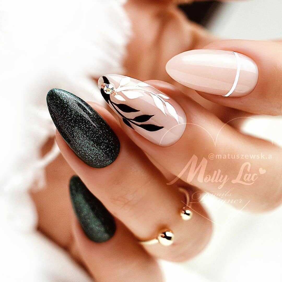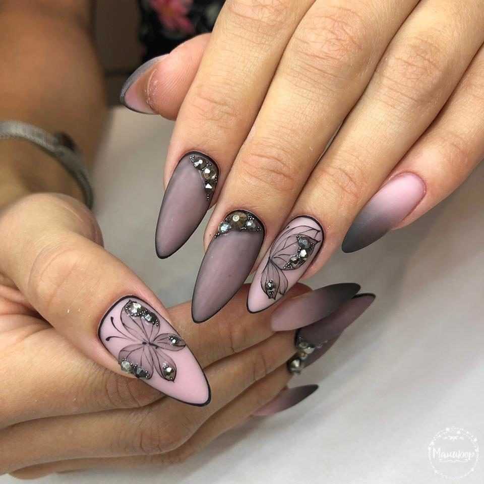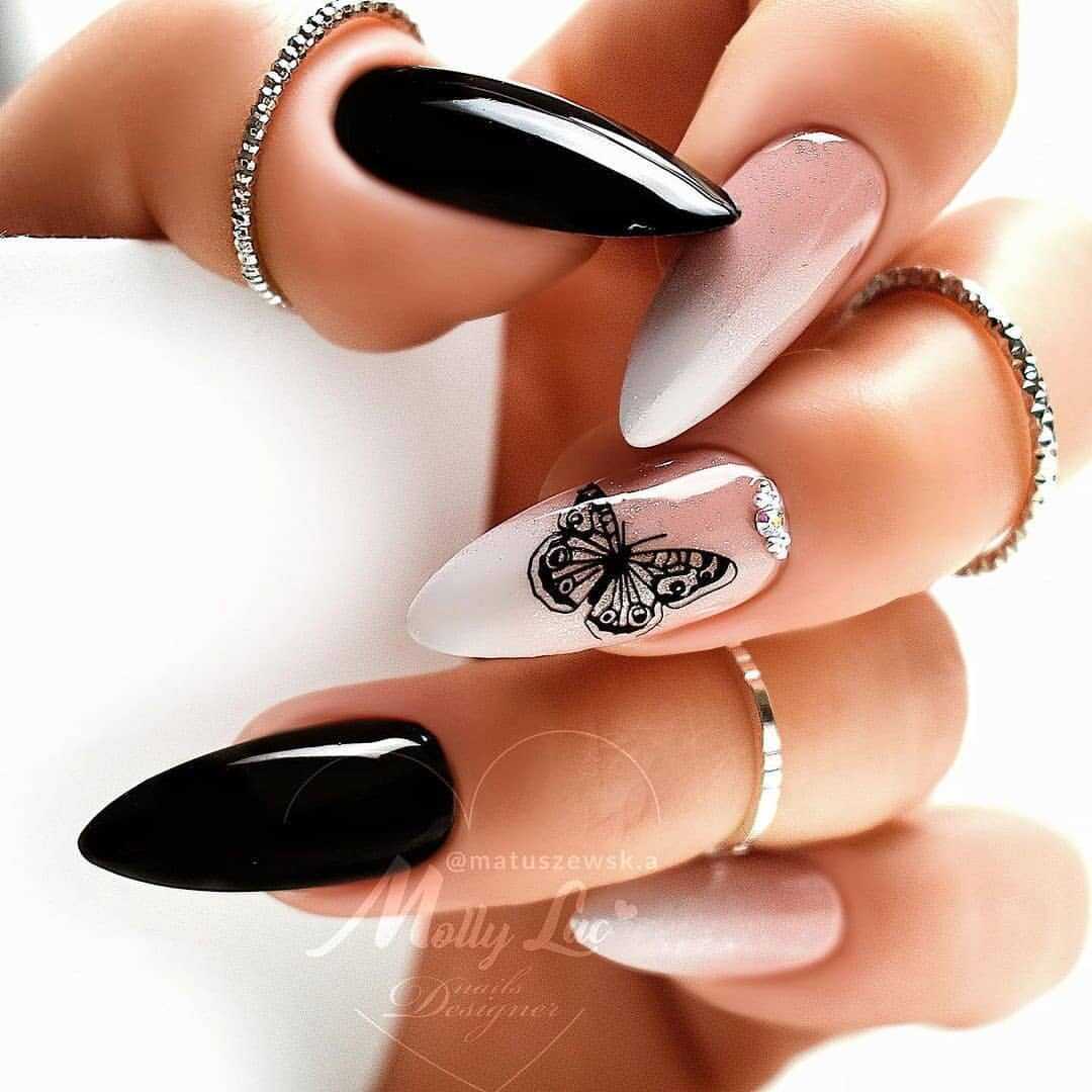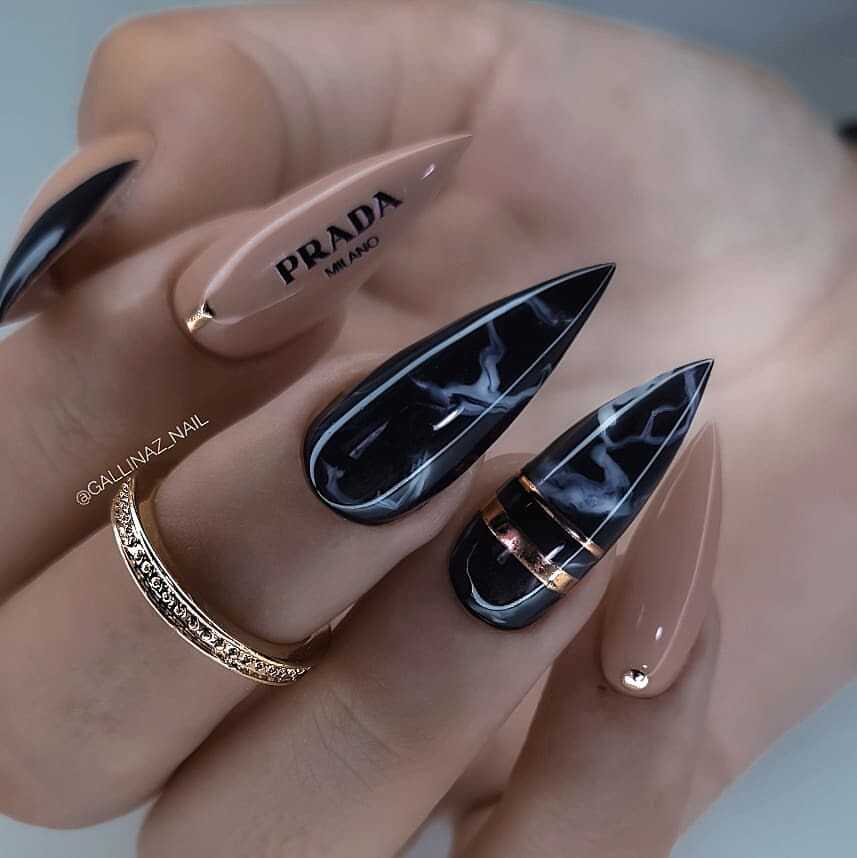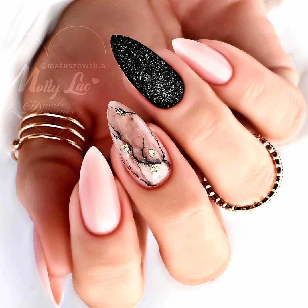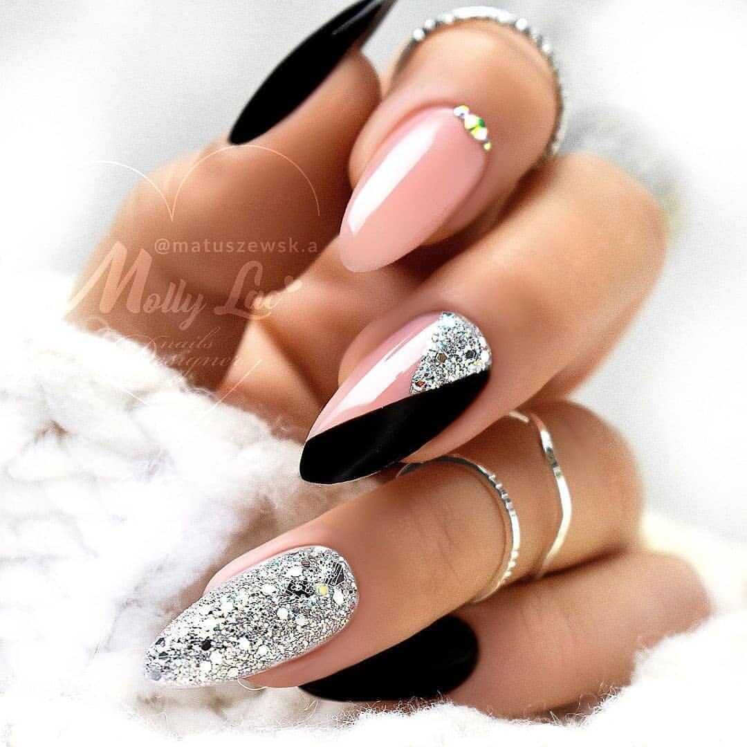 В наши дни уже никто не сторонится чёрного лака, поскольку его завораживающая глубина невероятно красиво смотрится в различных идеях маникюра. А сочетание заострённой формы ногтевых пластин с этим удивительным цветом позволяет создать самые невероятные идеи нейл-дизайна, которые заставят вас навсегда влюбиться в подобный маникюр. Ноготки с чёрным основанием чудесно сочетаются со стразами, кусочками фольги, камифубуки и элементами «битого стекла». Их можно дополнять цветным гелем-паутинкой и сочетать с другими оттенками лака, дополнять глиттером, геометрическими сюжетами и прочими изображениями.