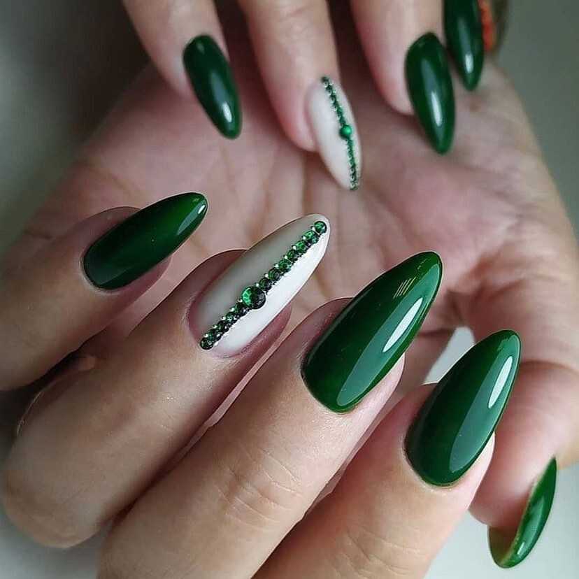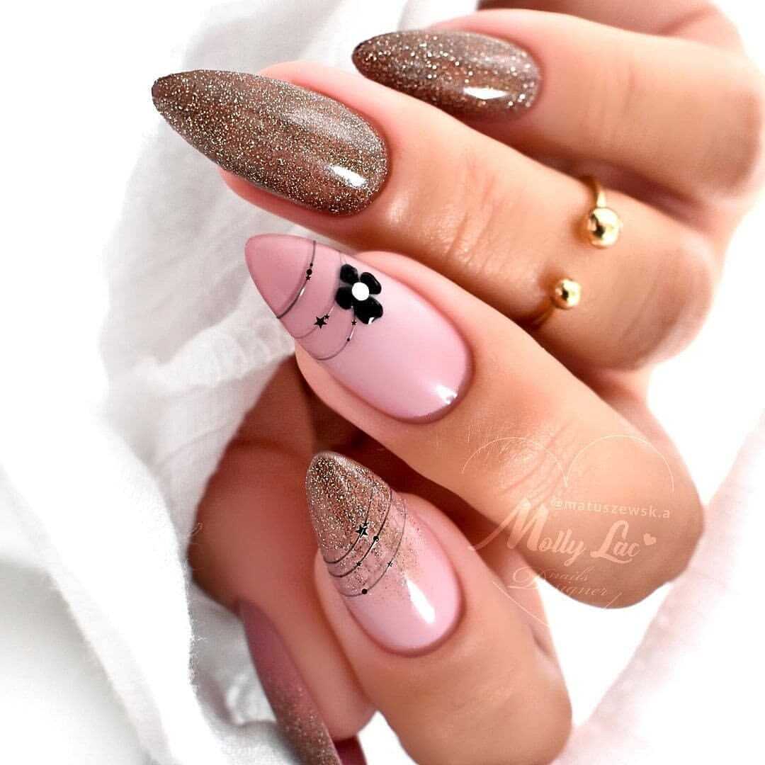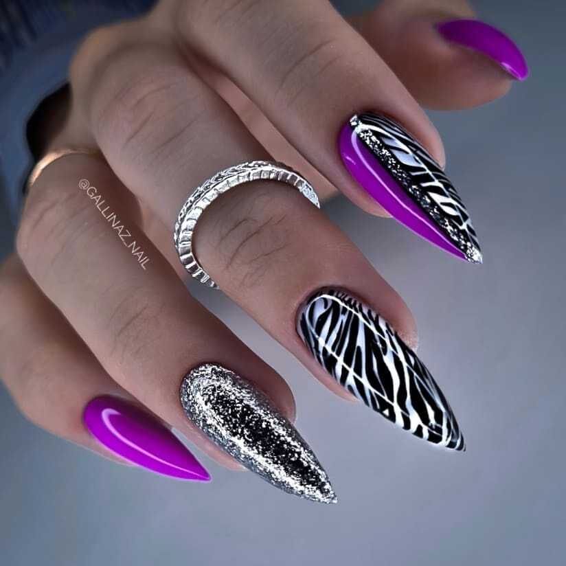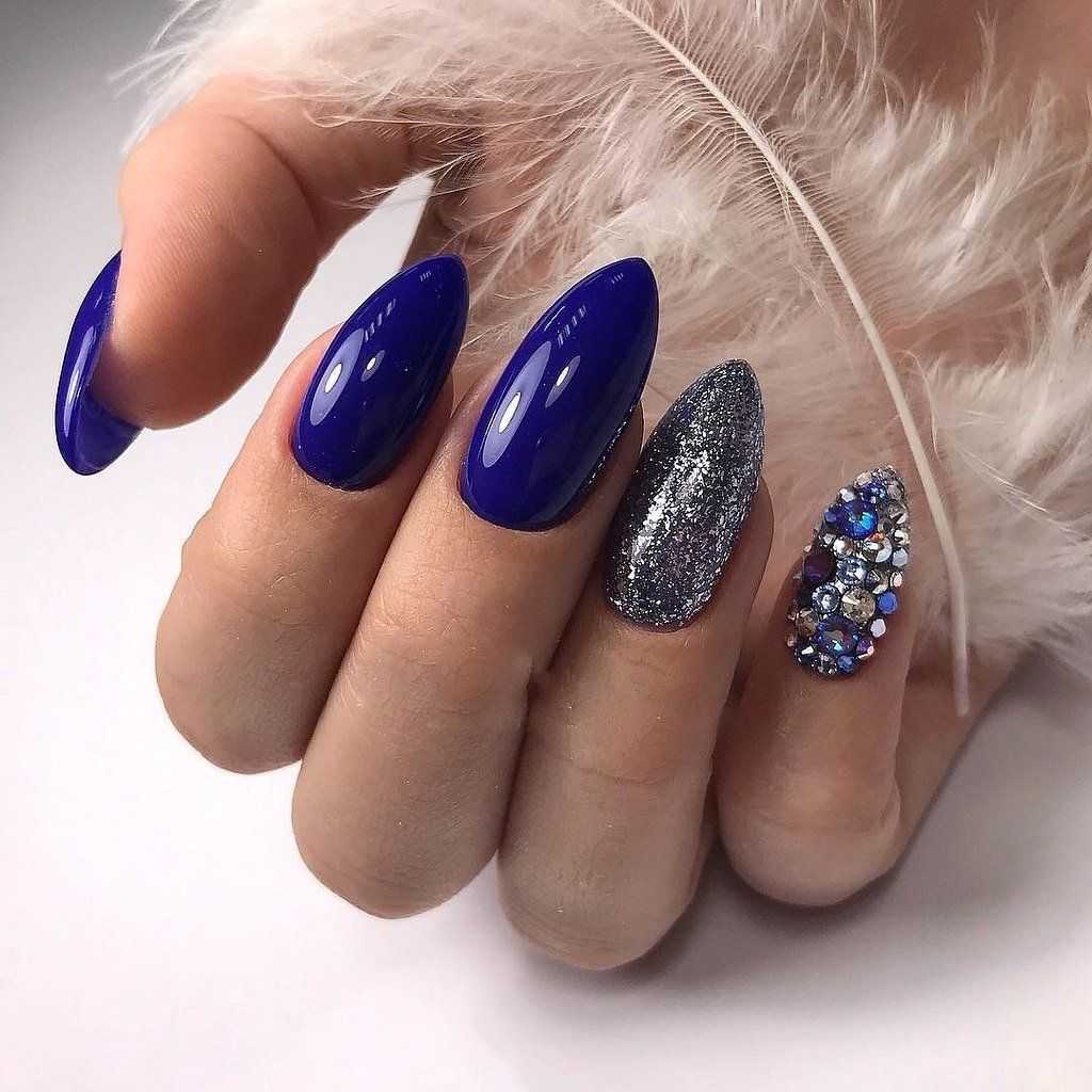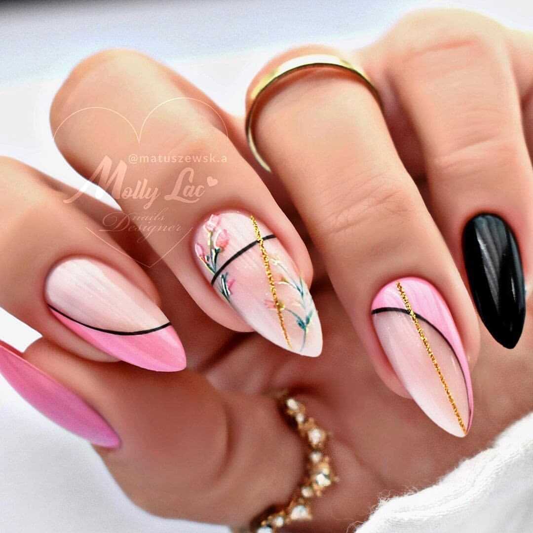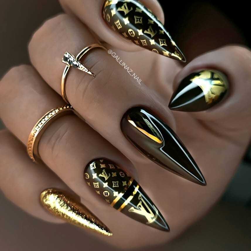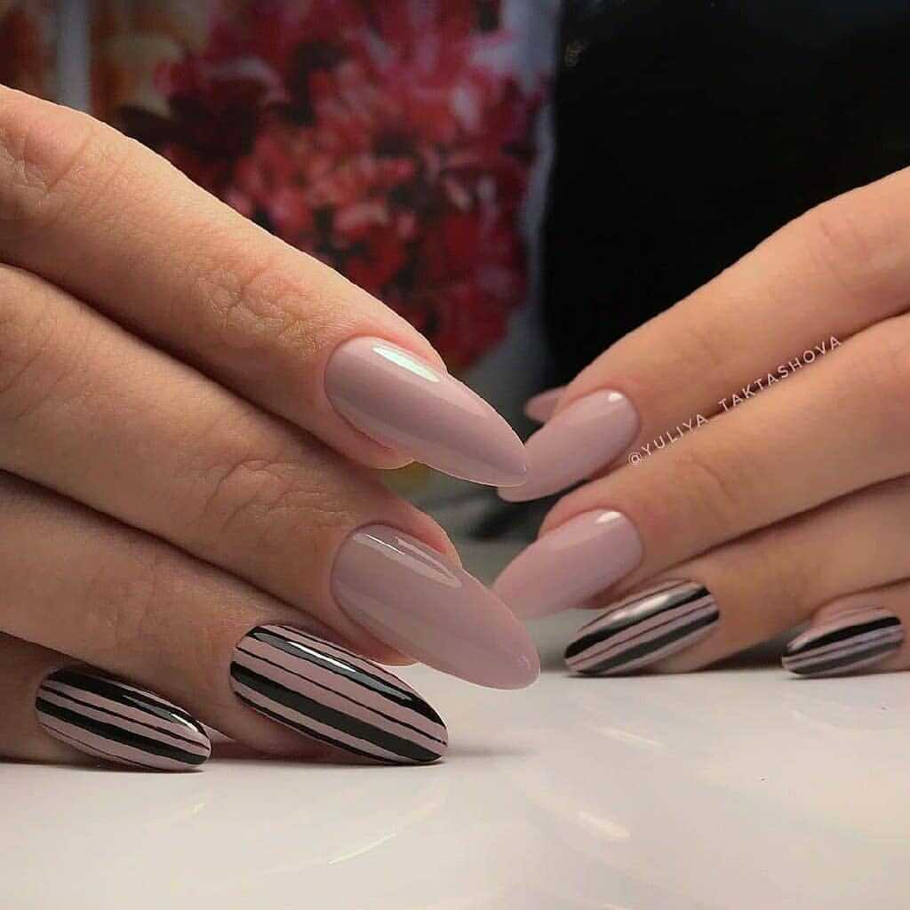 В наши дни уже никто не сторонится чёрного лака, поскольку его завораживающая глубина невероятно красиво смотрится в различных идеях маникюра. А сочетание заострённой формы ногтевых пластин с этим удивительным цветом позволяет создать самые невероятные идеи нейл-дизайна, которые заставят вас навсегда влюбиться в подобный маникюр. Ноготки с чёрным основанием чудесно сочетаются со стразами, кусочками фольги, камифубуки и элементами «битого стекла». Их можно дополнять цветным гелем-паутинкой и сочетать с другими оттенками лака, дополнять глиттером, геометрическими сюжетами и прочими изображениями.