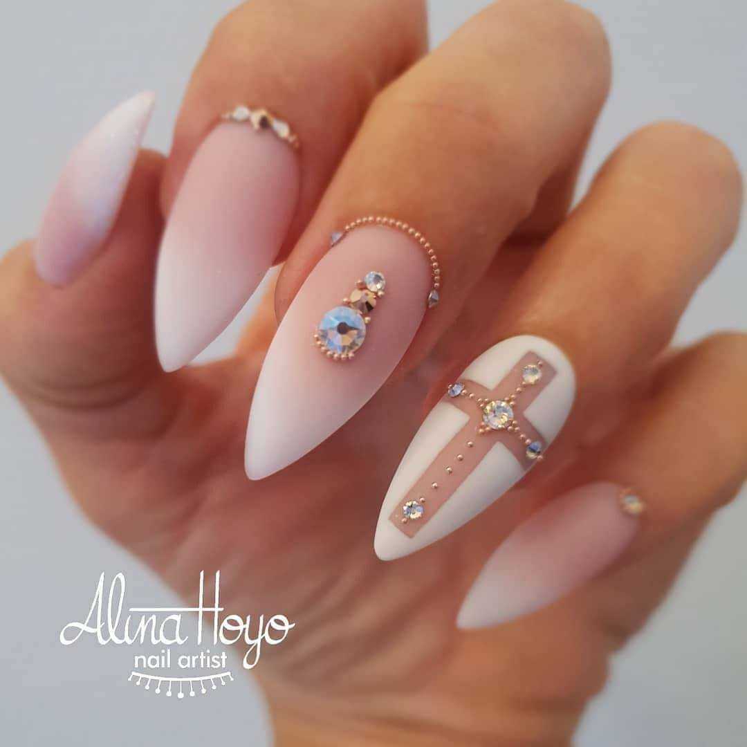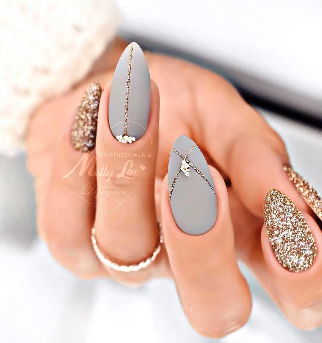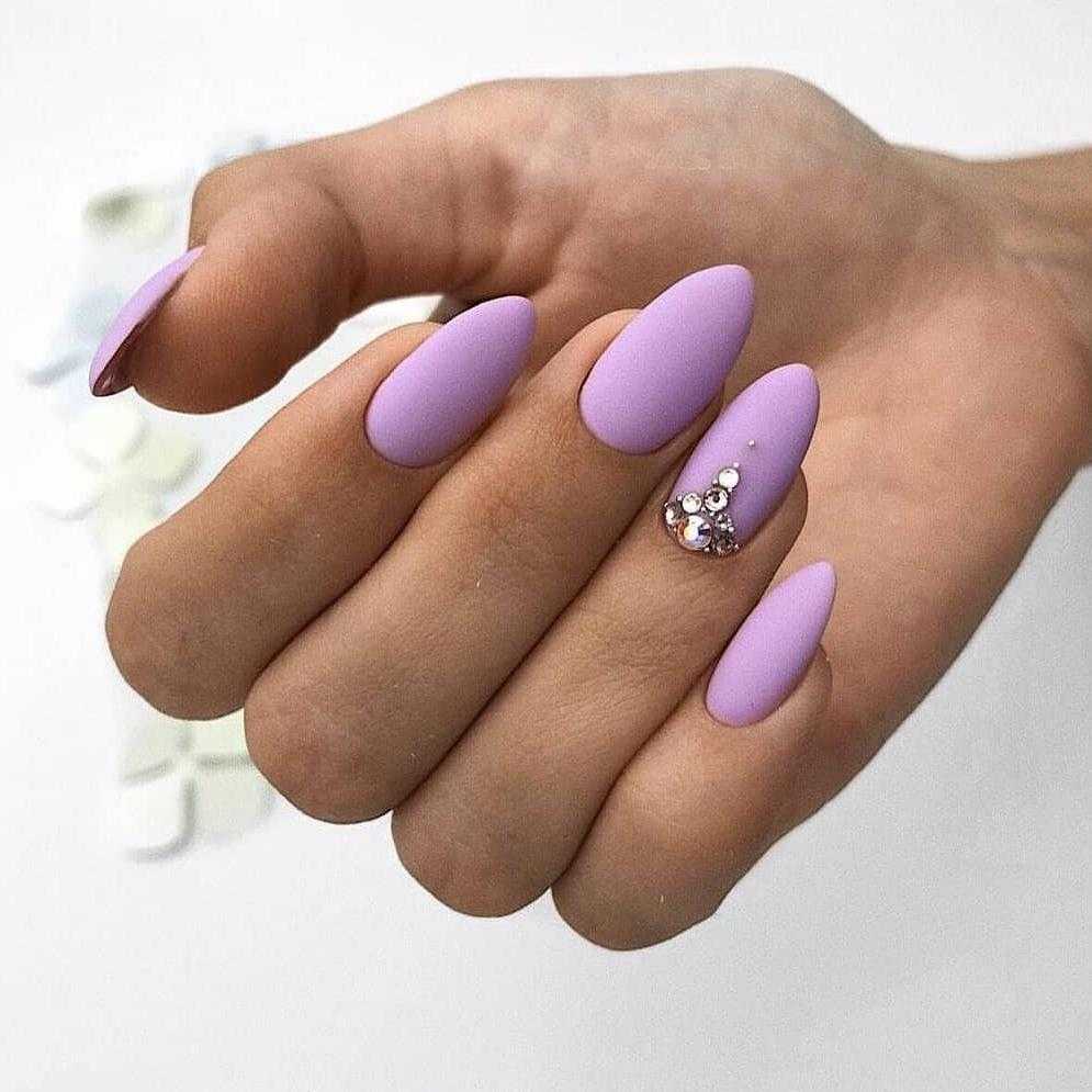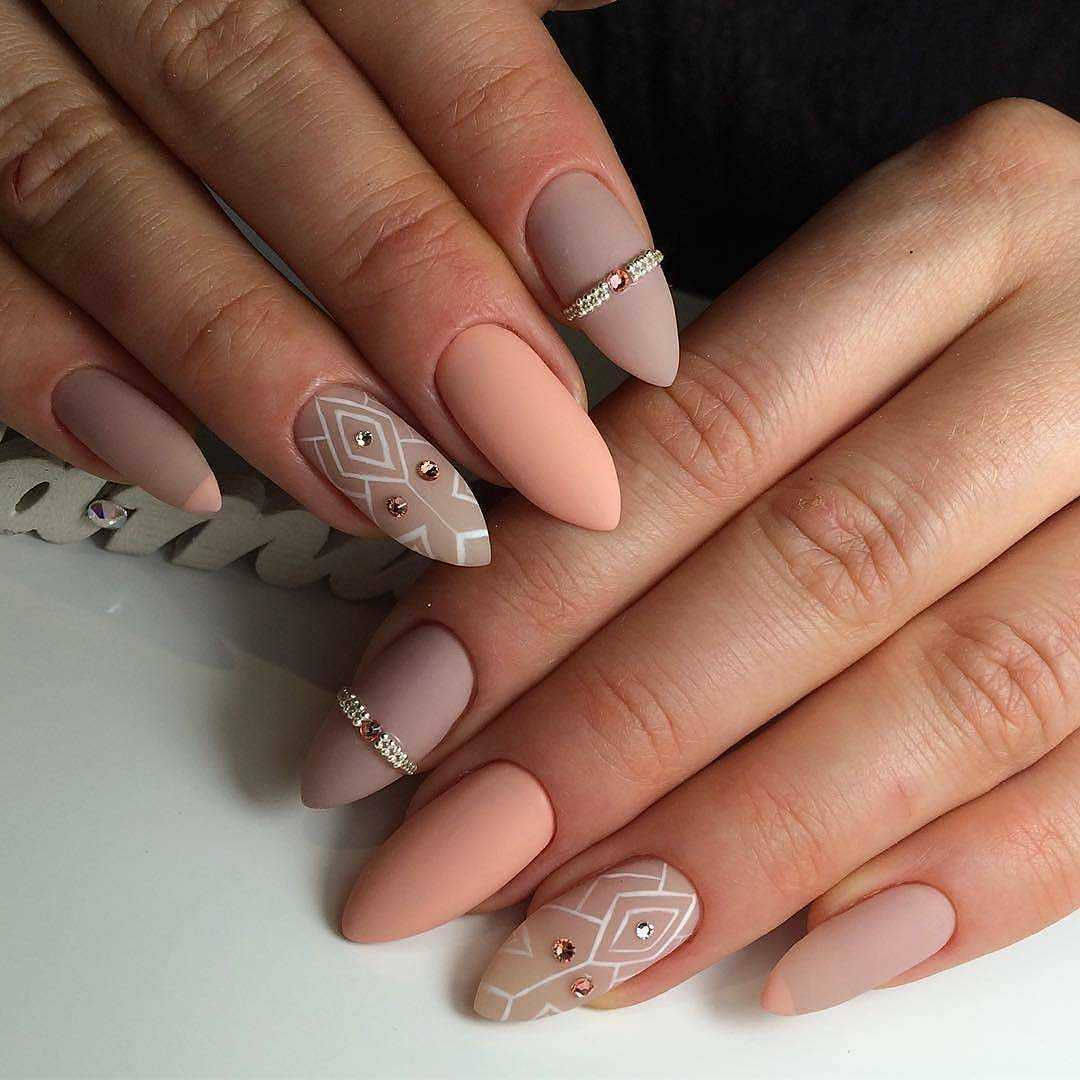 Бархатистое матовое покрытие не только невероятным образом смягчает и сглаживает все оттенки лака, но и облагораживает любую длину и форму ногтей. Поэтому в новомодном сезоне нейл-дизайнеры предложили для маникюра на острые ногти немало красивых идей оформления с матовым топом, которые станут прекрасным дополнением любого повседневного либо вечернего образа. В списке трендов лаконичные однотонные вариации маникюра, начиная от самых светлых, заканчивая глубокими тёмными. А также всевозможные вариации градиента и маникюра с блестящими украшениями в виде металлизированных полос и узоров из стразов. Матовая основа волшебно сочетается с рисунками, объёмными фигурками из лепнины либо пластика, хрустальной крошкой и глянцевым покрытие