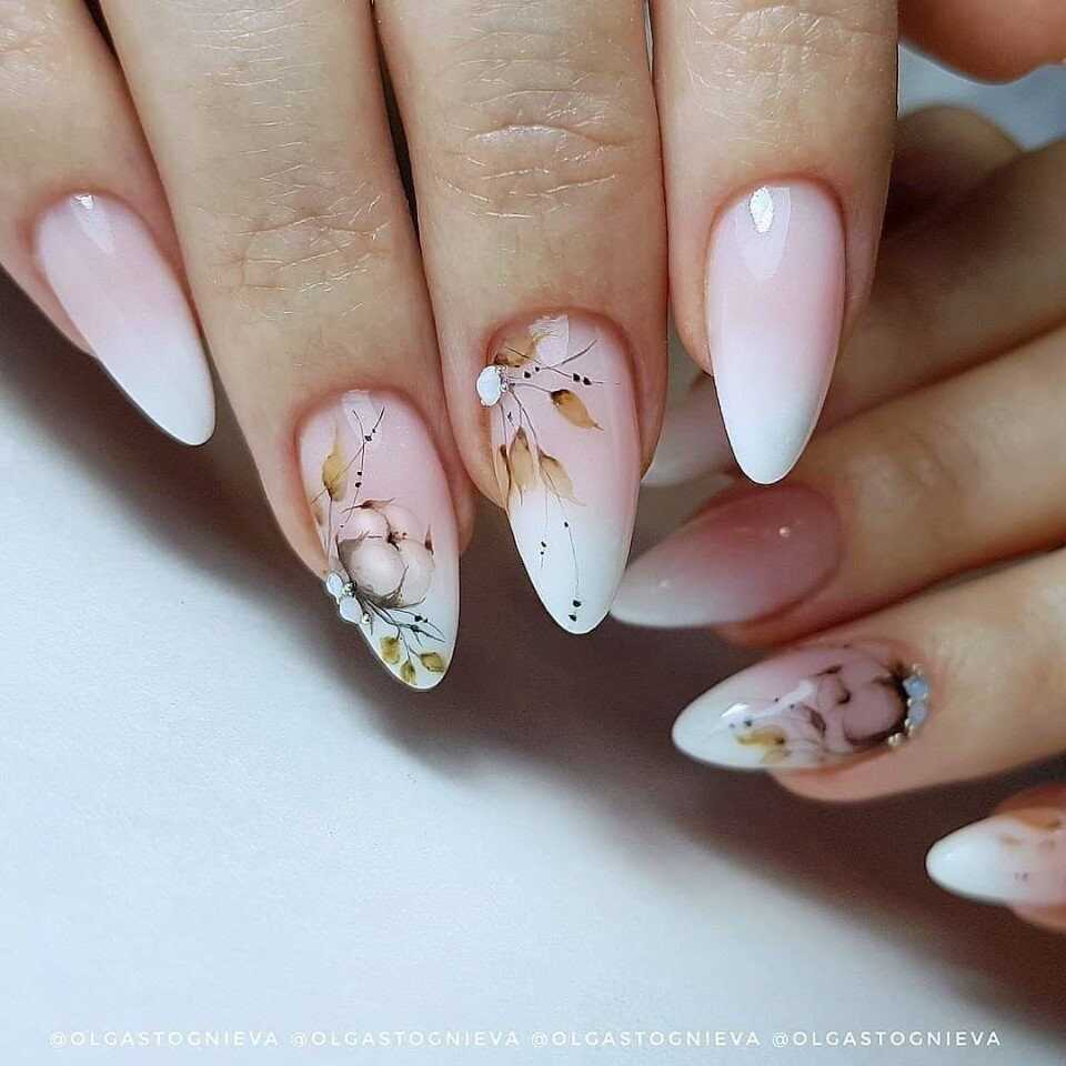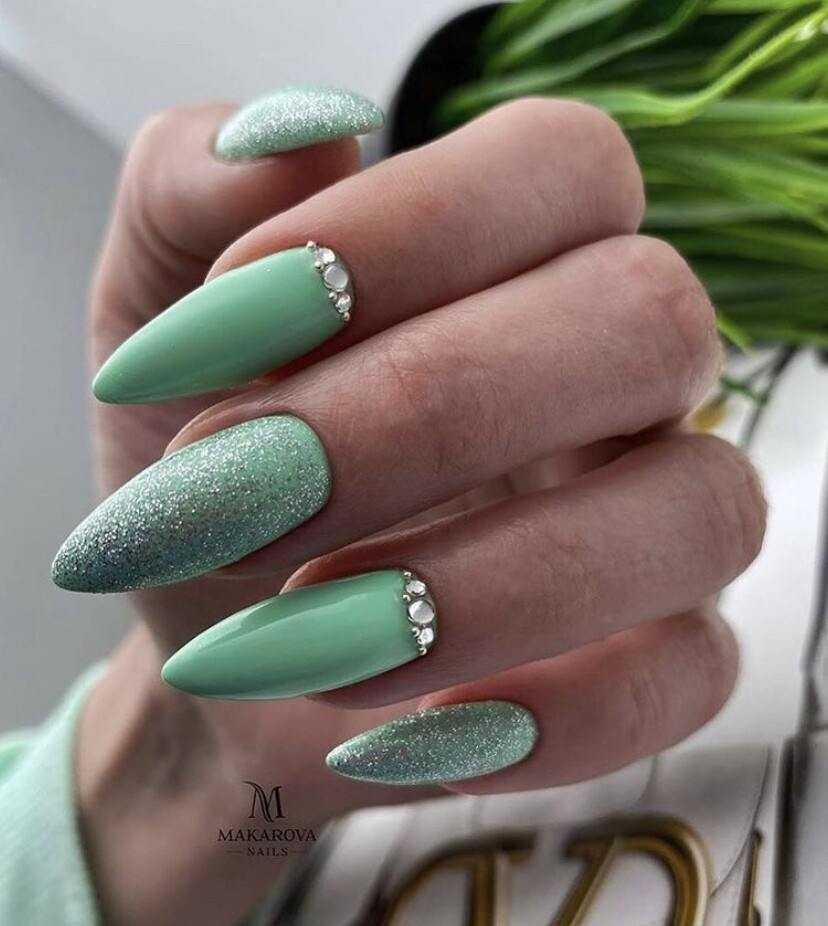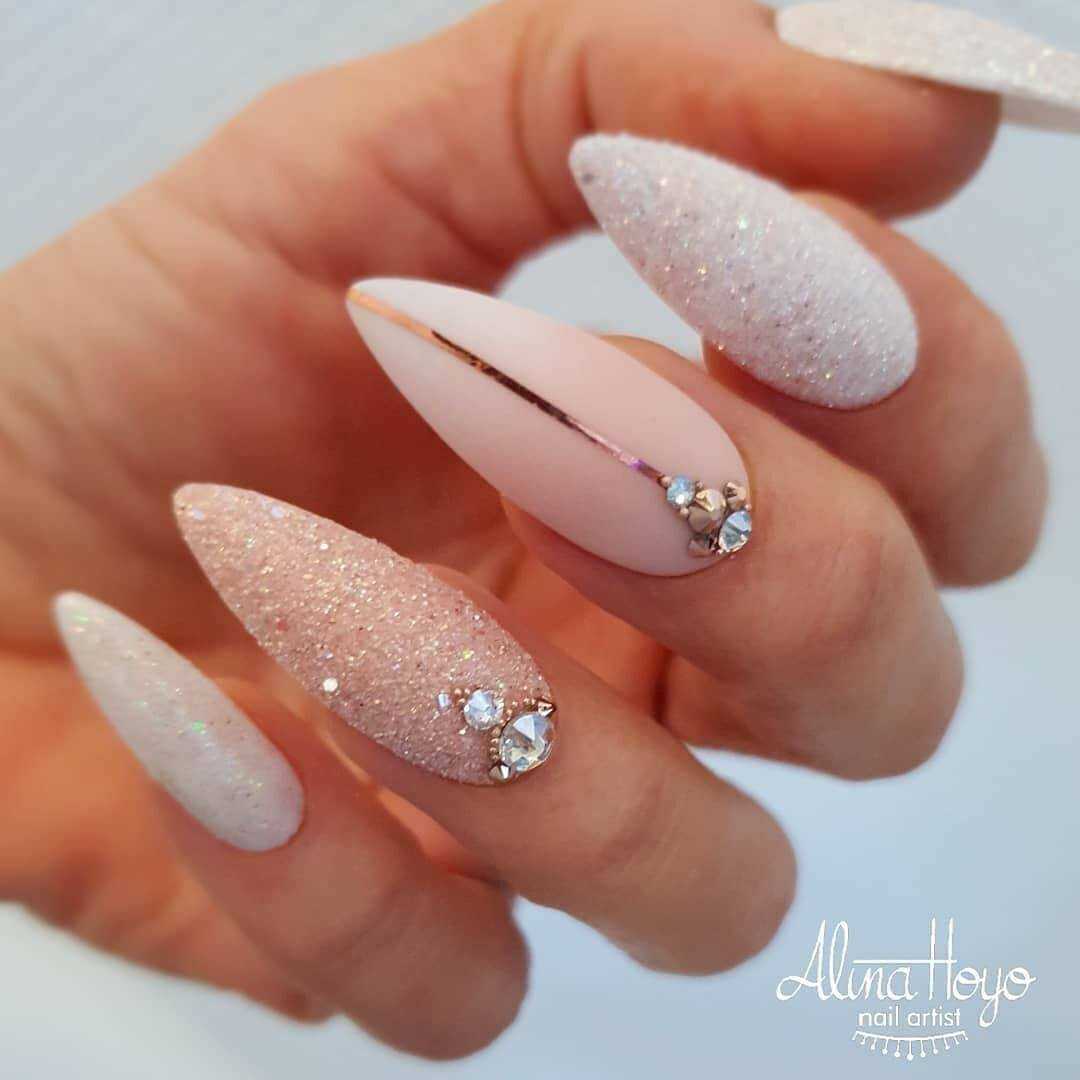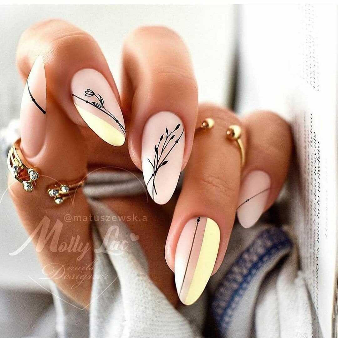 Бархатистое матовое покрытие не только невероятным образом смягчает и сглаживает все оттенки лака, но и облагораживает любую длину и форму ногтей. Поэтому в новомодном сезоне нейл-дизайнеры предложили для маникюра на острые ногти немало красивых идей оформления с матовым топом, которые станут прекрасным дополнением любого повседневного либо вечернего образа. В списке трендов лаконичные однотонные вариации маникюра, начиная от самых светлых, заканчивая глубокими тёмными. А также всевозможные вариации градиента и маникюра с блестящими украшениями в виде металлизированных полос и узоров из стразов. Матовая основа волшебно сочетается с рисунками, объёмными фигурками из лепнины либо пластика, хрустальной крошкой и глянцевым покрытие