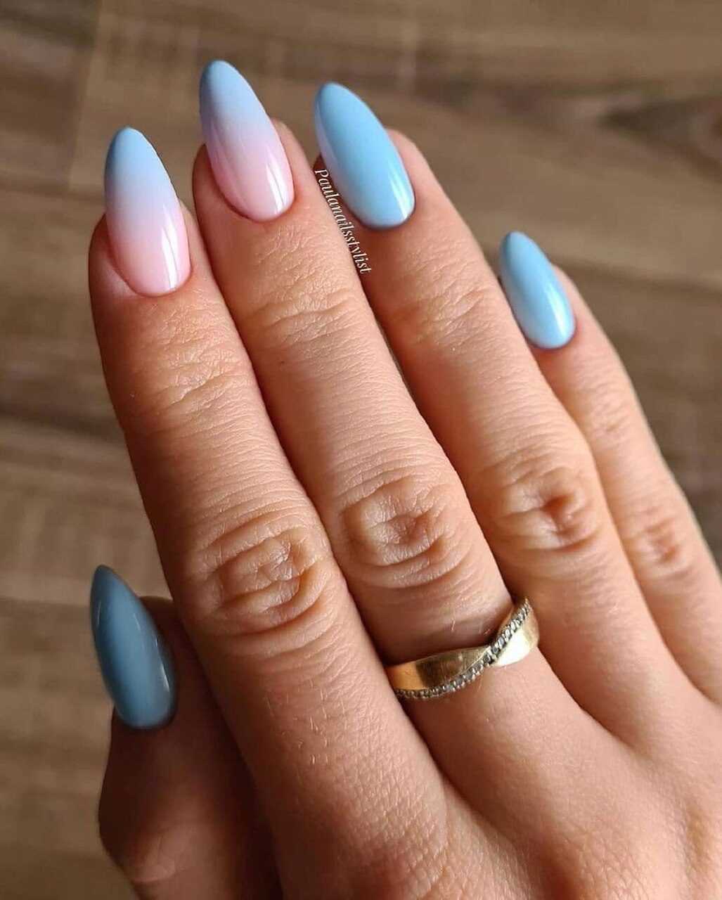 Ещё одна особенность градиента заключается в том, что границы между цветами здесь как бы размываются — в результате возникает ощущение, что оттенки буквально растворяются друг в друге. Наиболее распространённый вариант градиента в нейл-дизайне предполагает сочетание двух или трёх цветов.