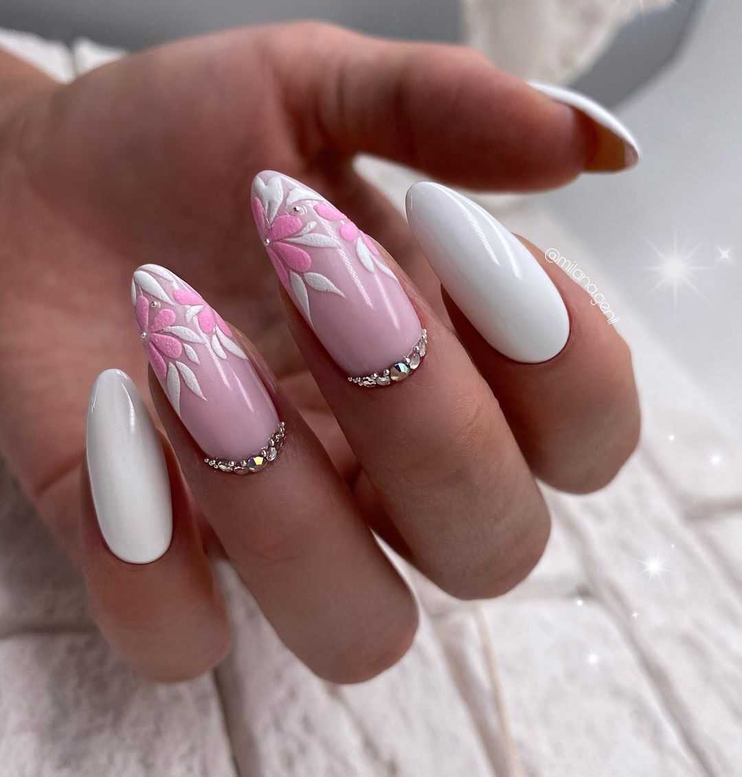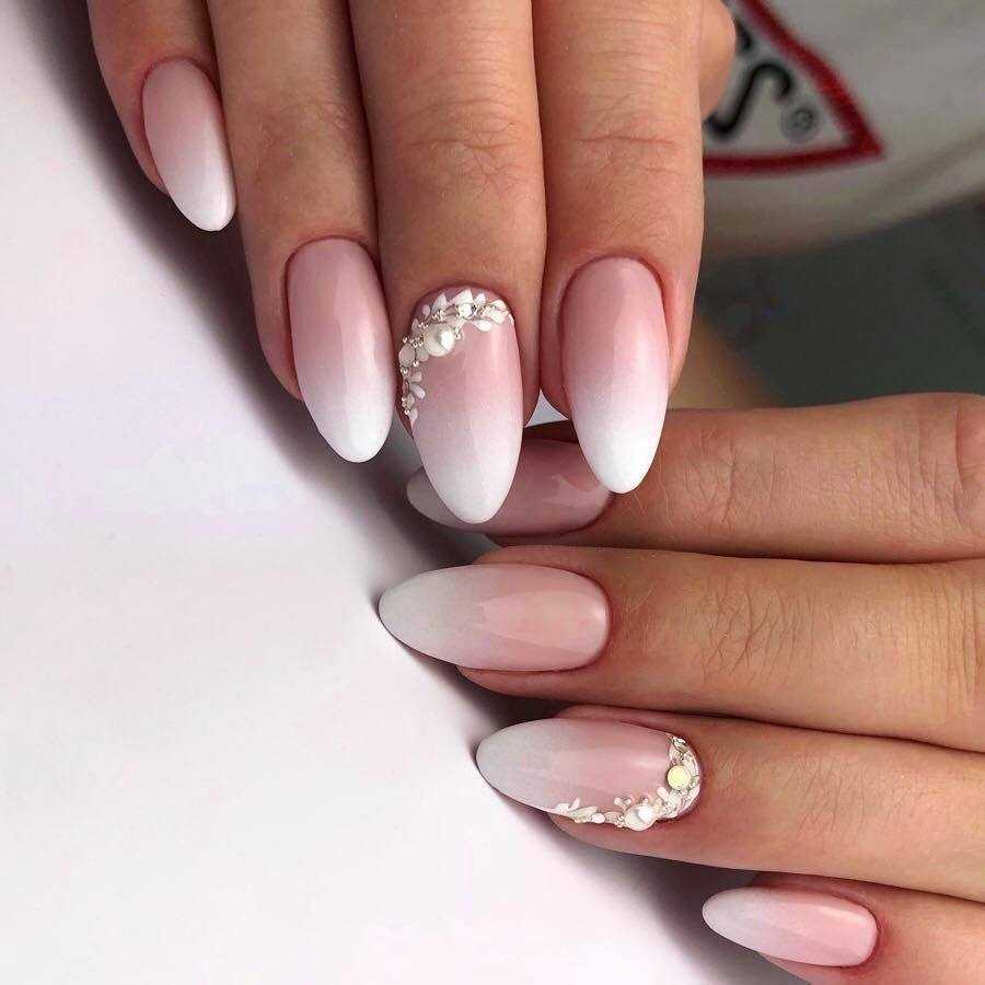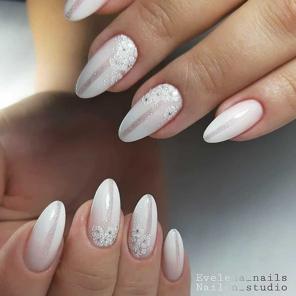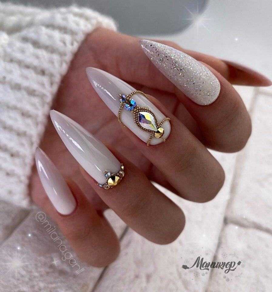Лаковое покрытие белого цвета – это классика маникюра, которая никогда не выйдет из моды. В этом случае, в зависимости от модных тенденций меняются лишь направления дизайна и техники. Такой вид оформления смотрится невероятно изящно без всяких дополнений и прекрасно сочетается с любым видом декора. Среди популярных предложений однотонное покрытие и френч, маникюр с выделением акцентного ноготка, дизайн с перламутровой втиркой, лепкой и цветочными рисунками. На белом фоне очень красиво смотрятся цветные и однотонные стразы, при помощи которых можно выделить лунулу у основания либо создать оригинальные композиции и глиттерная растяжка. Кроме того, белый цвет удачно сочетается с другими оттенками, что можно также использовать в нейл-дизайне на острые ногти.