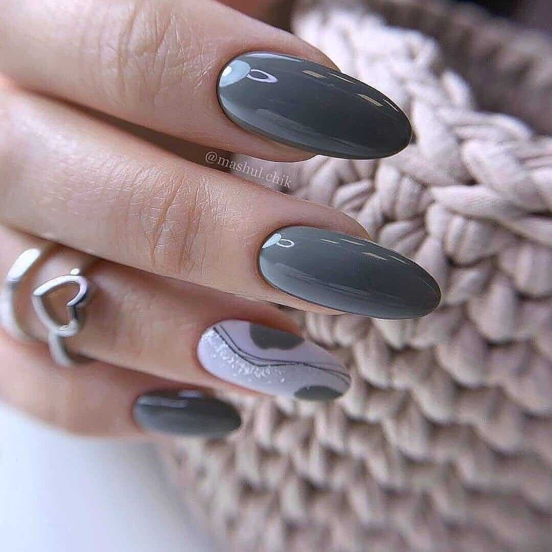 На фото можете обратить внимание, что это сочетание белого и черного лака, которое при смешении выдает сразу несколько оттенков серого. Сам по себе дизайн смотрится эффектно