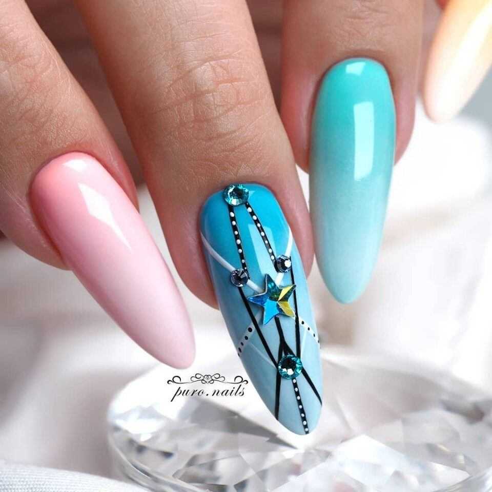 К услугам модниц – все многообразие цветовой палитры. Сочетания могут быть самыми смелыми, от изумрудно-сапфирового до черно-белого контраста. Изображения либо рисуются от руки, либо наносятся специальными штампами, обычными и 3D-наклейками.