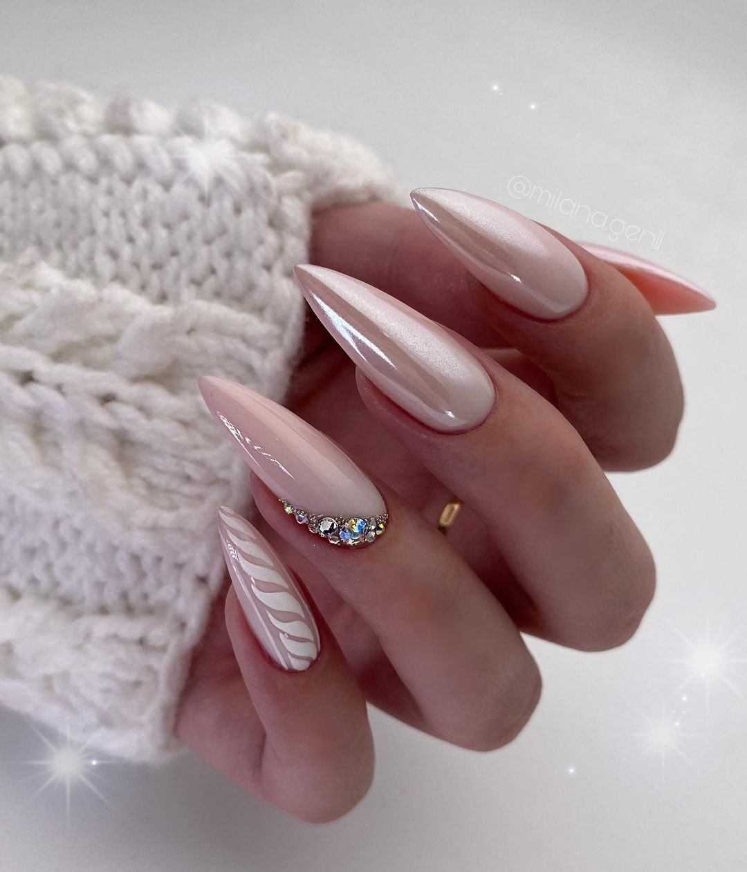 Если выбираете однотонный дизайн, то в этом сезоне рекомендуем обратить внимание на молочной вариант. Это трендовые и очень практичной Находка для любой длины, но особенно эффектно смотрится на большой. Кроме того, очень стильно смотрятся украшения в стиле минимализм.