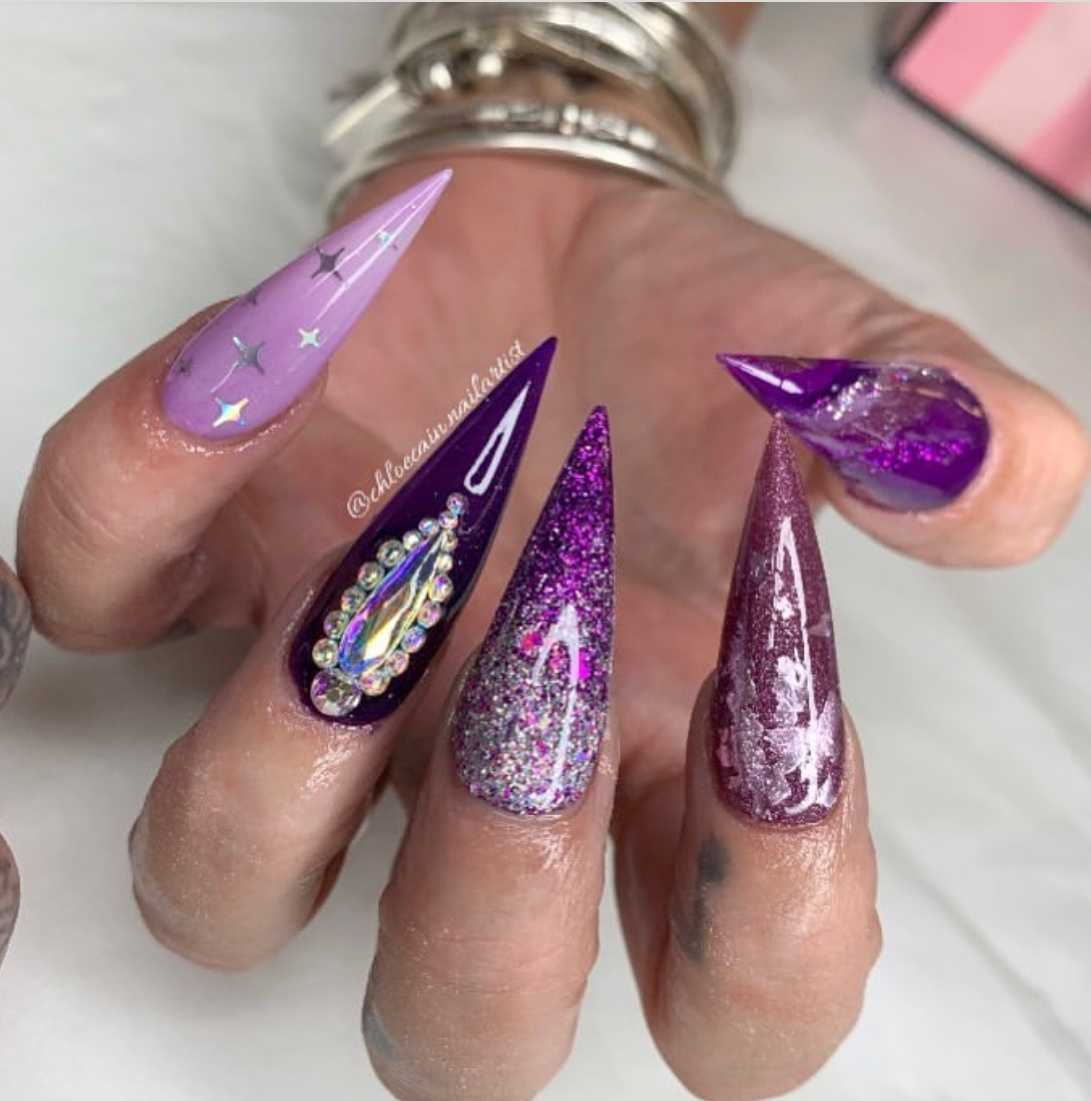 Хотя сейчас слишком большая длина не считается актуальным трендом по мнению многих стилистов, длинные острые ногти однозначно подходят для создания выразительного нэйл-дизайна перед Хэллоуином. Ультраострый маникюр только прибавит хищности и опасности вашему образу, а любые расцветки и рисунки будут смотреться притягательнее и ярче. Даже капли обычного пурпурного лака на темном фоне заставят окружающих сомневаться, не настоящая ли вампирша перед ними?