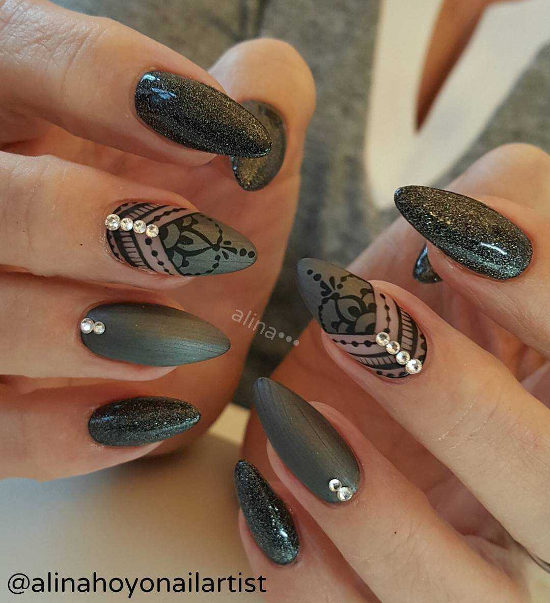 Шикарным дополнением миндального маникюра станет черный гель-лак. Используйте его для прорисовки кружевного декора, абстракции и флористики. Также не лишними будут стразы и камни в серебряном или черном цвете, аккуратно расположившиеся в прикорневой зоне. С помощью красного цвета на ногтях можно выполнить великолепные бутоны роз. Используйте для дизайна специальный витражный гель-лак, который позволит создать объемный аквариумный эффект.