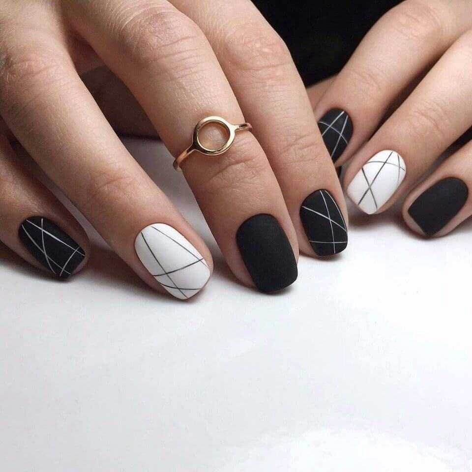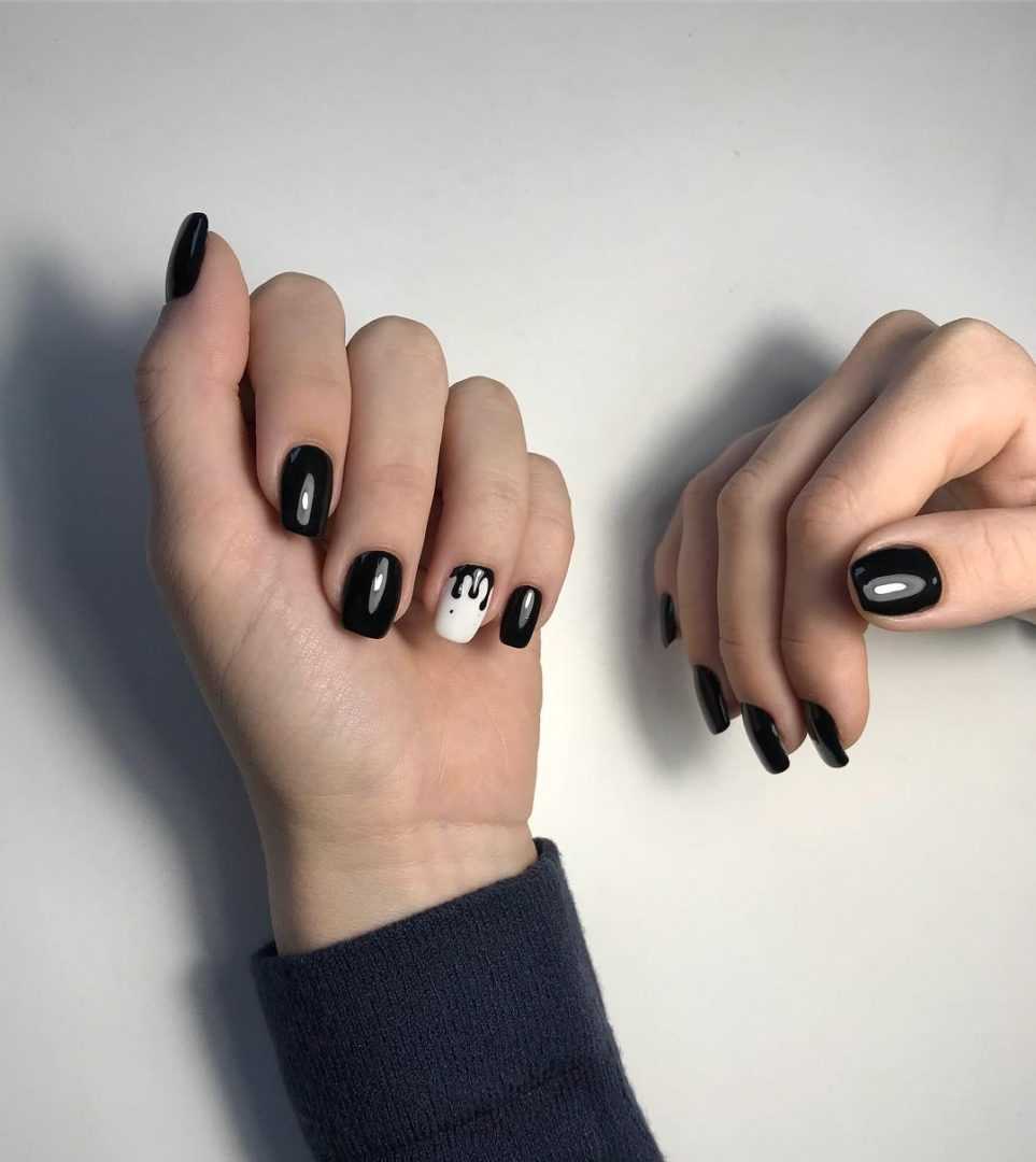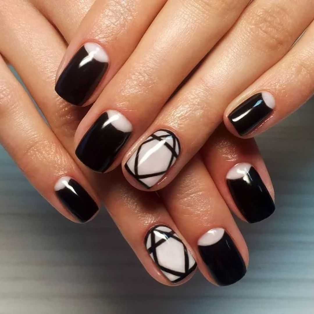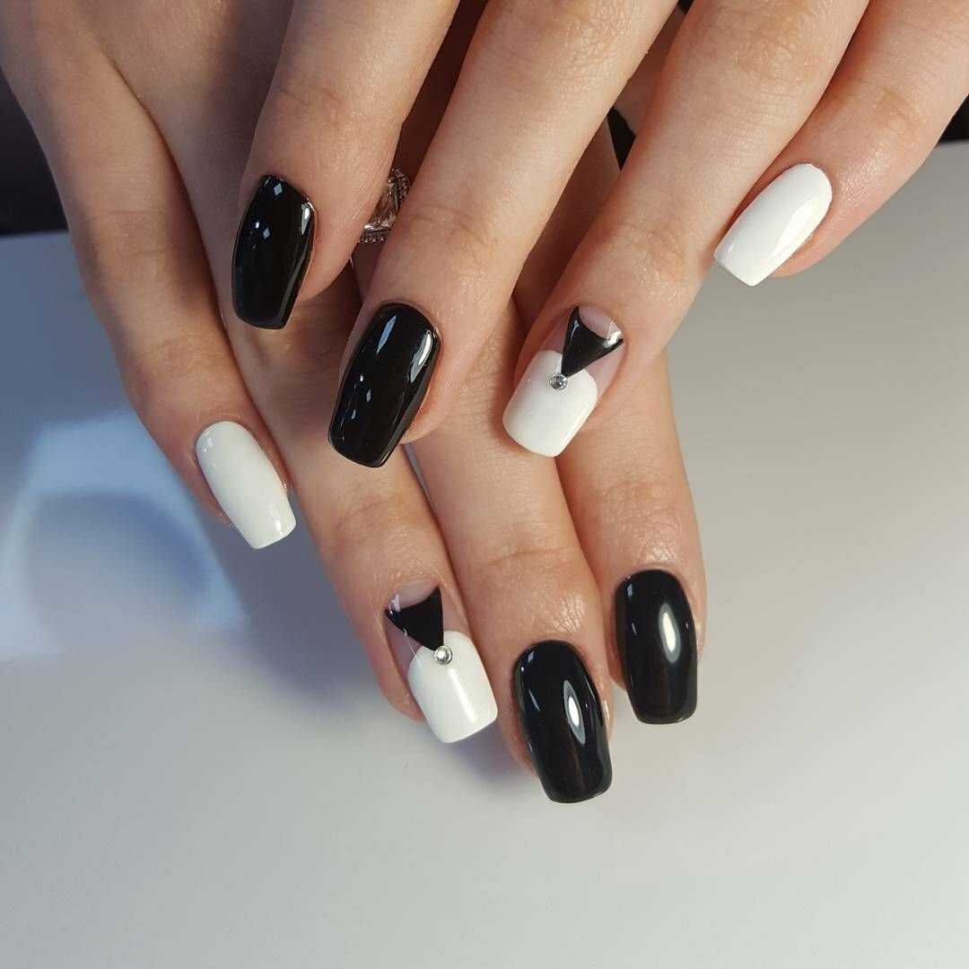 Вы также можете выбрать простой дизайн с великолепными деталями или ногти с инкрустацией, которые в настоящее время в тренде. Сочетание черного с белым на короткие ногти есть возможность выполнить в различных техниках, выделяя несколько ногтей.