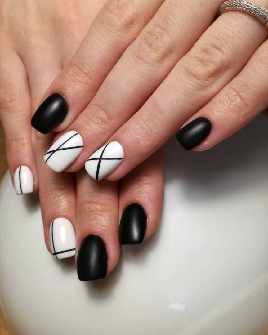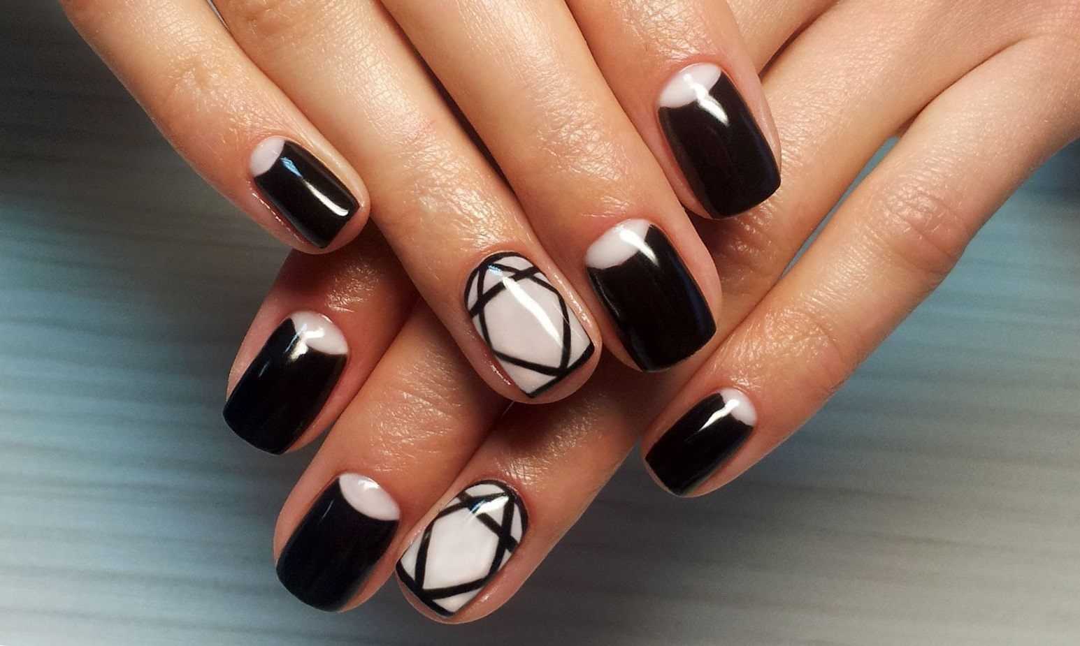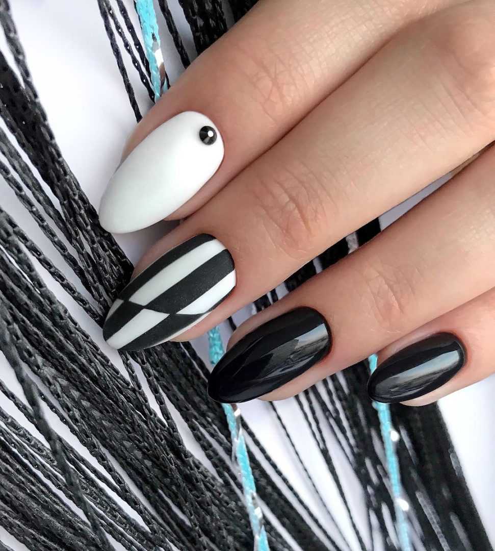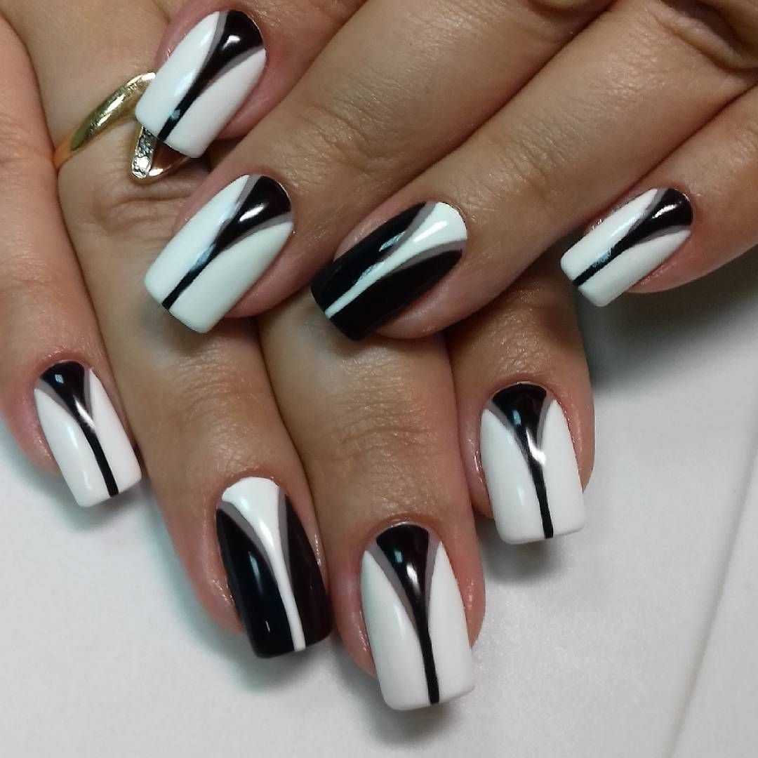 Вы также можете выбрать простой дизайн с великолепными деталями или ногти с инкрустацией, которые в настоящее время в тренде. Сочетание черного с белым на короткие ногти есть возможность выполнить в различных техниках, выделяя несколько ногтей.