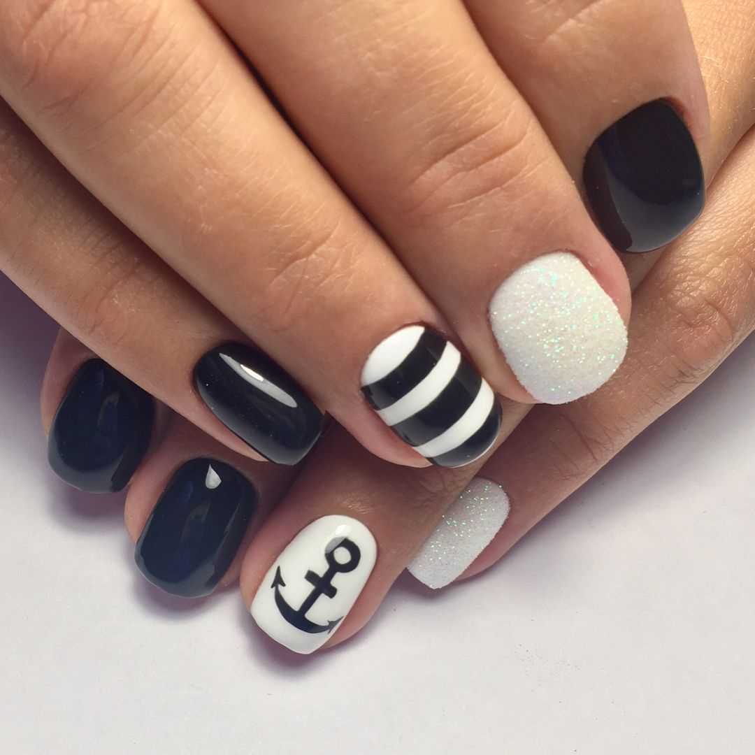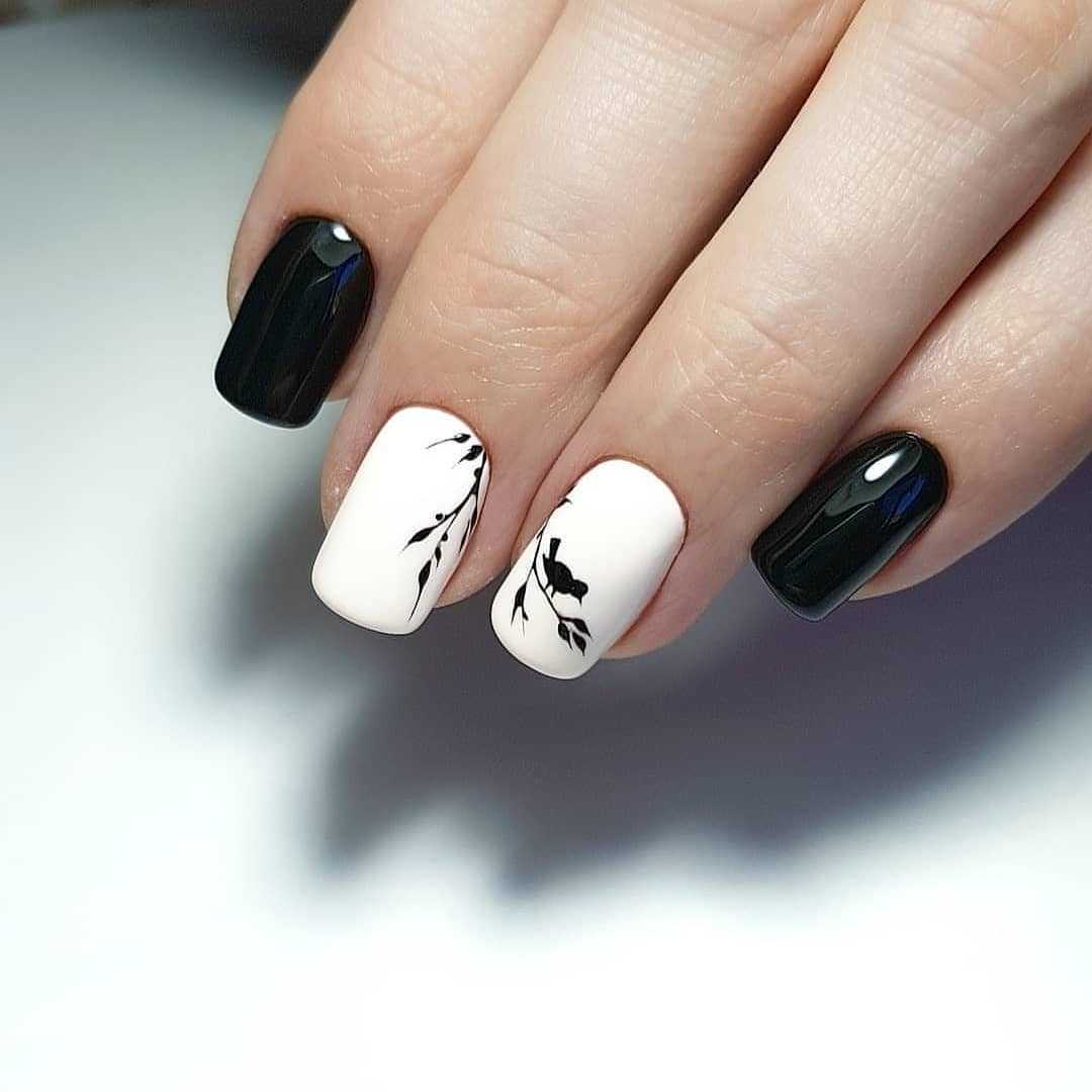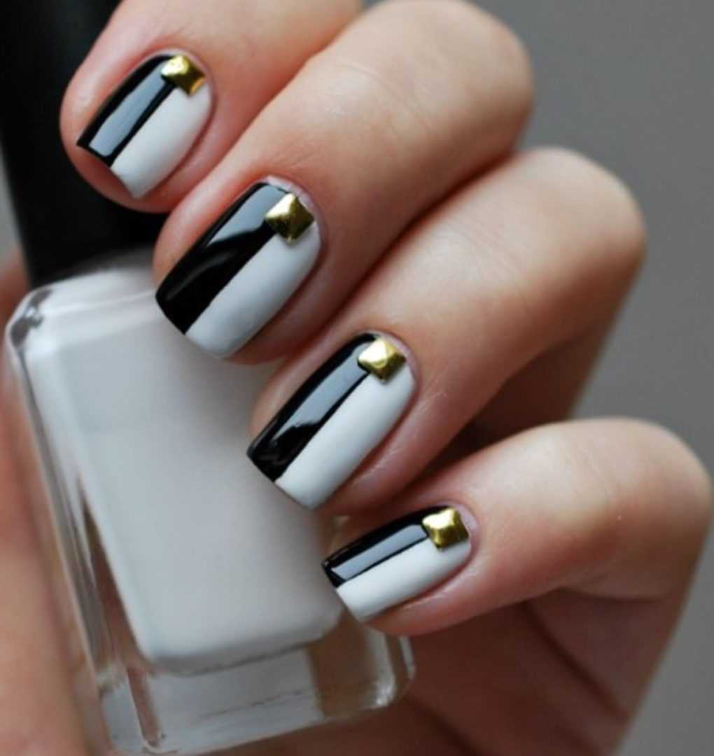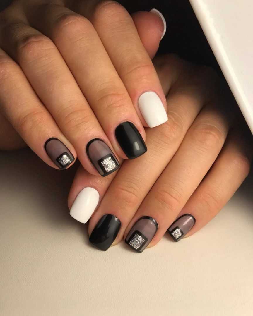 Вы также можете выбрать простой дизайн с великолепными деталями или ногти с инкрустацией, которые в настоящее время в тренде. Сочетание черного с белым на короткие ногти есть возможность выполнить в различных техниках, выделяя несколько ногтей.