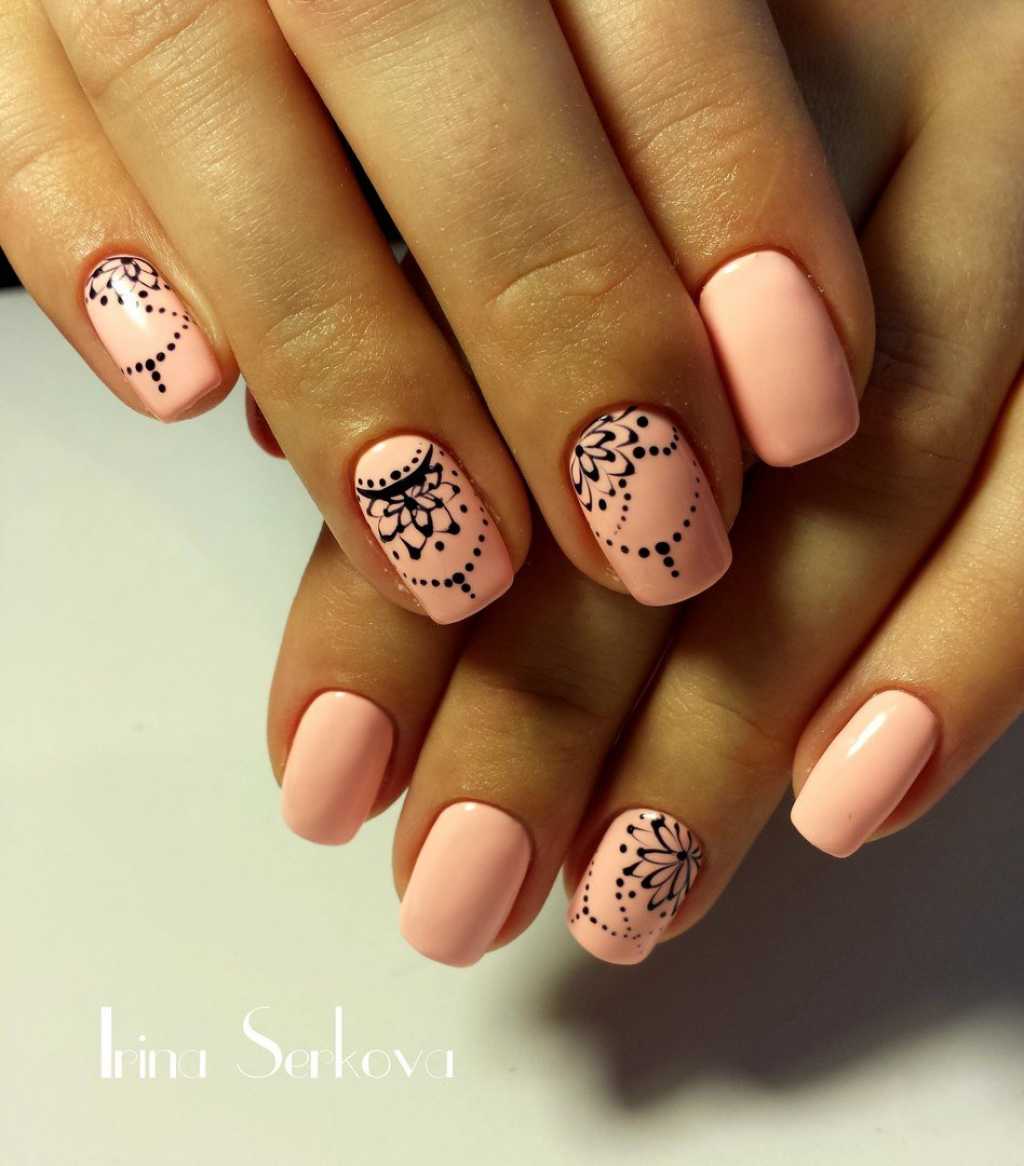 Теперь ноготки модниц украшают не большие точки, по несколько штук на ноготь, а множество миниатюрных точек, которые вместе создают удивительные узоры мехенди. Только взгляните насколько лаконично смотрится маникюр с дизайном точками. Возьмите за основу красивые примеры росписи рук и тела и перенесите их на свои ноготки. Очень красиво такой узор смотрится на светлом фоне, при этом рисунок выполняется насыщенным черным лаком.