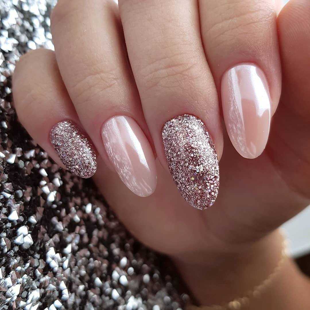 Наиболее распространенный декор, который из года в год не теряет своей популярности. Маникюр с блестками на миндальных ногтях — это стильное и модное решение для каждого сезона. Сухие или жидкие, гелеобразные, блестяшки дают огромные возможности для экспериментов.