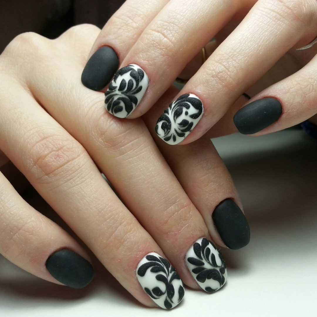 Поэтому такой маникюр будет отличаться наличием выпуклости и рельефности. Если говорить о более простой вариации маникюра, то это может быть стемпинг. В качестве базы можно использовать светлый лак, а орнамент будет окрашен в черный цвет. После этого необходимо аккуратно перенесите изображение на желаемый ноготь посредством применения силиконового штампа.