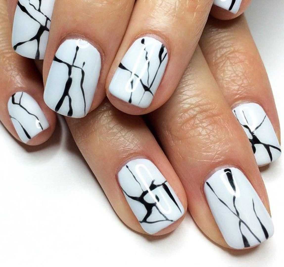 Набирает популярность мраморный маникюр, подходящий к ногтям небольшой длины, а также футуристический ромбовидный дизайн с глянцевыми витражами и гелевыми пластинами. В качестве новой черно-белой дизайнерской идеи возможно применение гель-лака, а также всевозможным металлических пигментов, а также набирающие популярность вставки.