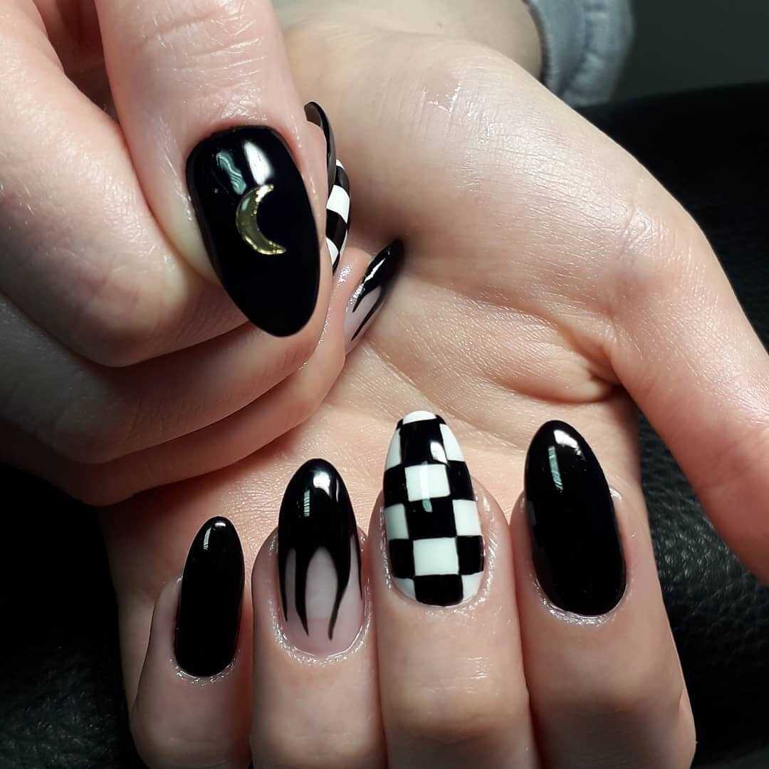 Если лунки ногтей накрасить белым цветом, то маникюр будет выглядеть очень эстетично, а если в качестве фона выбирать черный цвет, то он станет достаточно необычным. Также можно найти дизайн френча, в котором верх ногтей разделен на две диагональные линии, имеющие белый и черный цвета. Для любителей экспериментов — шахматная доска уникального дизайна. Конец ногтевой пластины расписан квадратами, которые заштрихованы белым и черным лаком.