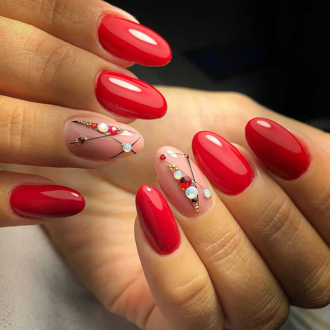 Миндальный и красный – на первый взгляд совершенно не сочетаемые оттенки, однако, в одном нейл-арте смотрятся невероятно стильно и красиво. С помощью этих оттенков профессиональные мастера создают потрясающий французский дизайн. При этом край ногтя окрашивается красным оттенком, а миндальным – остальное пространство ногтевой пластины.