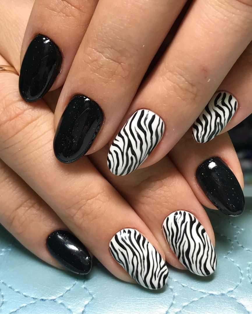 Стоит отметить, что чрезмерная длина ногтей уже не в тренде. Несмотря на это есть много тех, кто не согласен расставаться с большой длиной. В результате маникюр включает в себя самые уникальные виды узоров в стиле зебры. Оба могут выступать как взаимозаменяющие, так и служить дополнением друг друга.