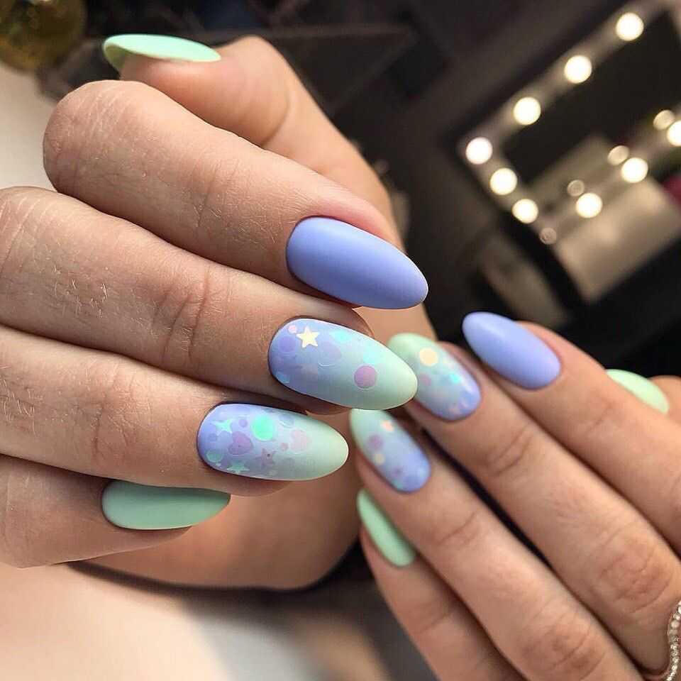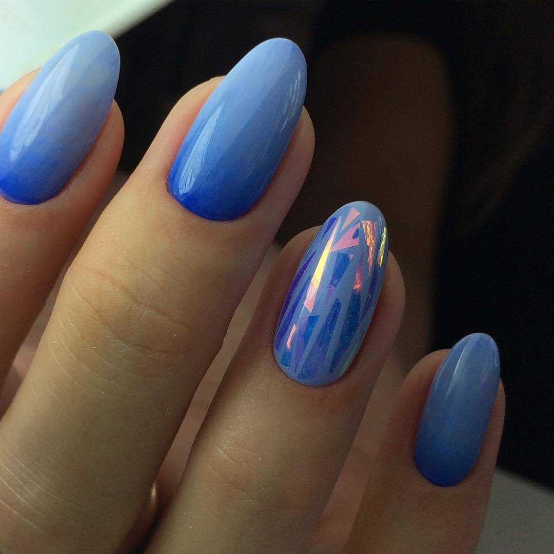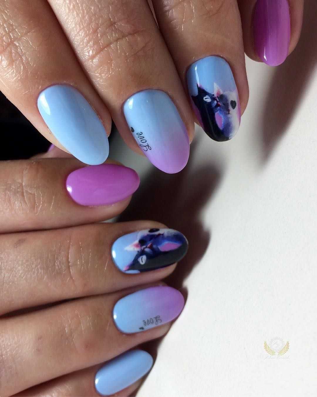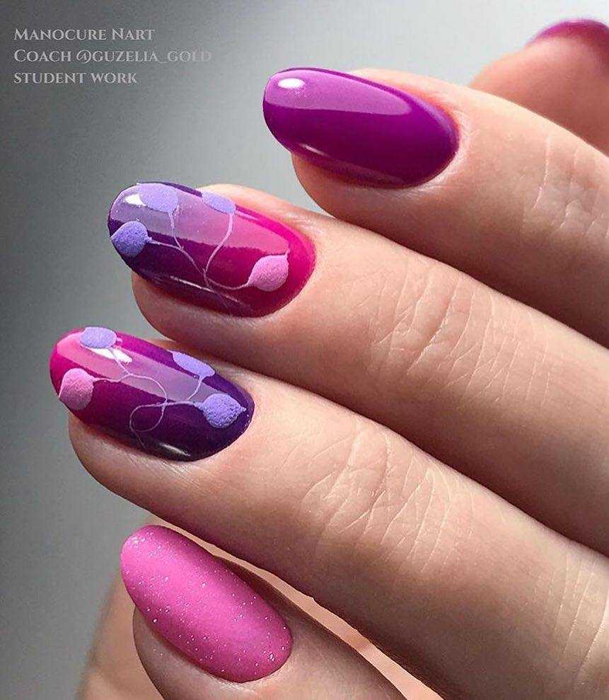 Для коротких ноготков овальной формы хорошо подойдёт однотонный дизайн. Не возбраняется его дополнение цветочками, минималистичными рисунками. На длинных ногтях лучше всего смотрится градиент в оттенках сирени.
