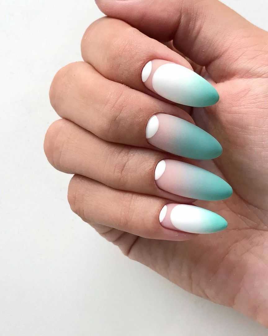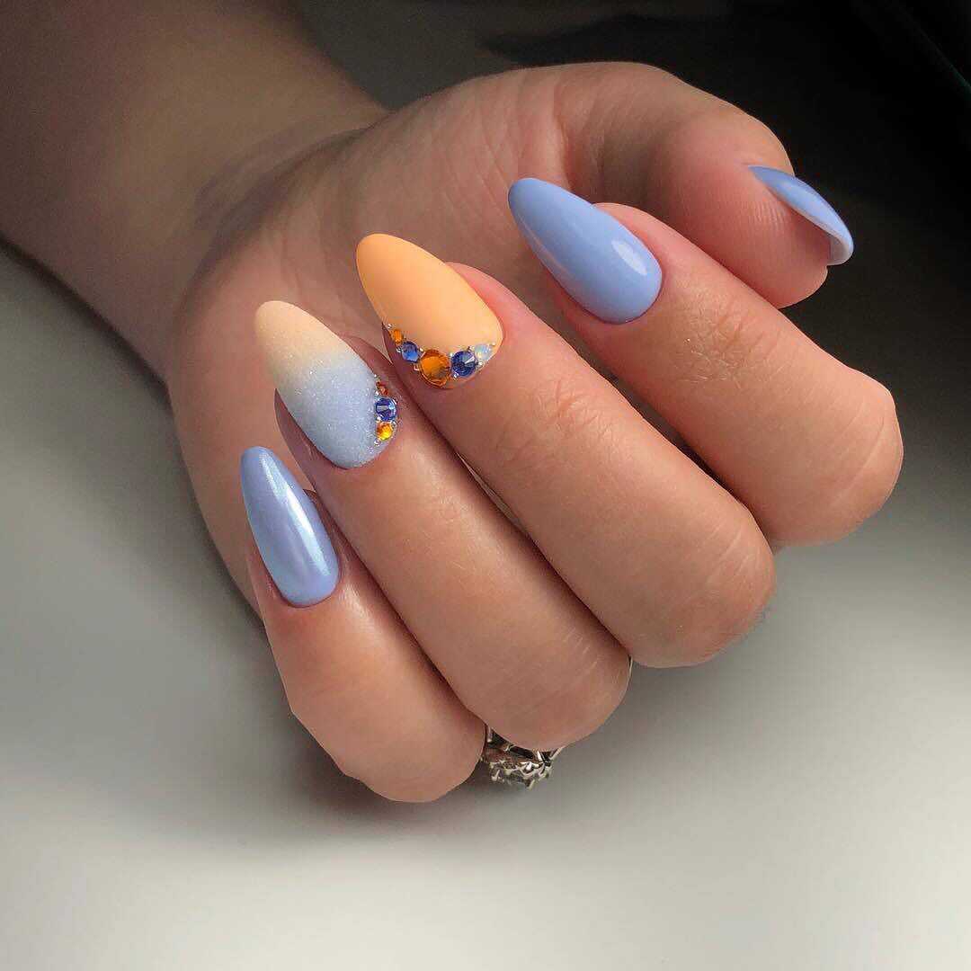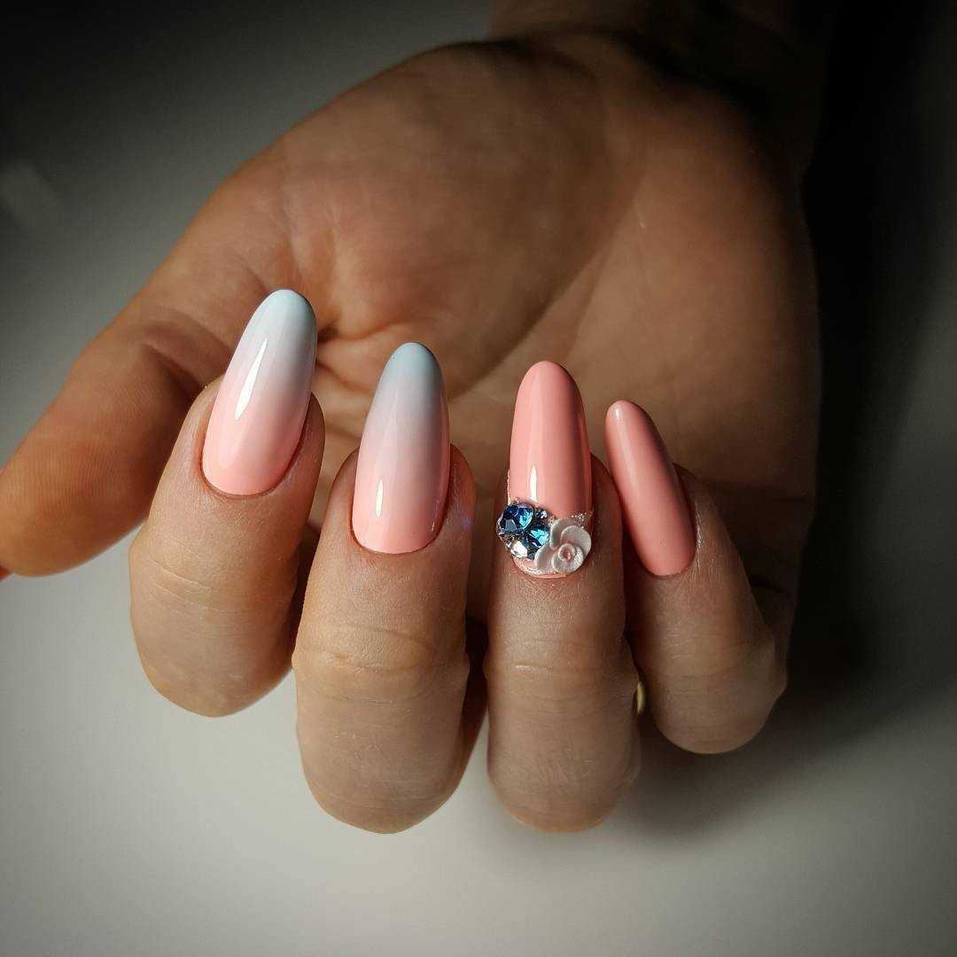 А вот большая или средняя длина больше подходит для омбре. Здесь получится растянуть цвет от более темного базового оттенка к светлому кончику. Ногти визуально удлинятся, а руки станут более изящными. Градиентный дизайн на длинной базе можно дополнить декором — втиркой, стразами или рисунком в стиле минимализм.