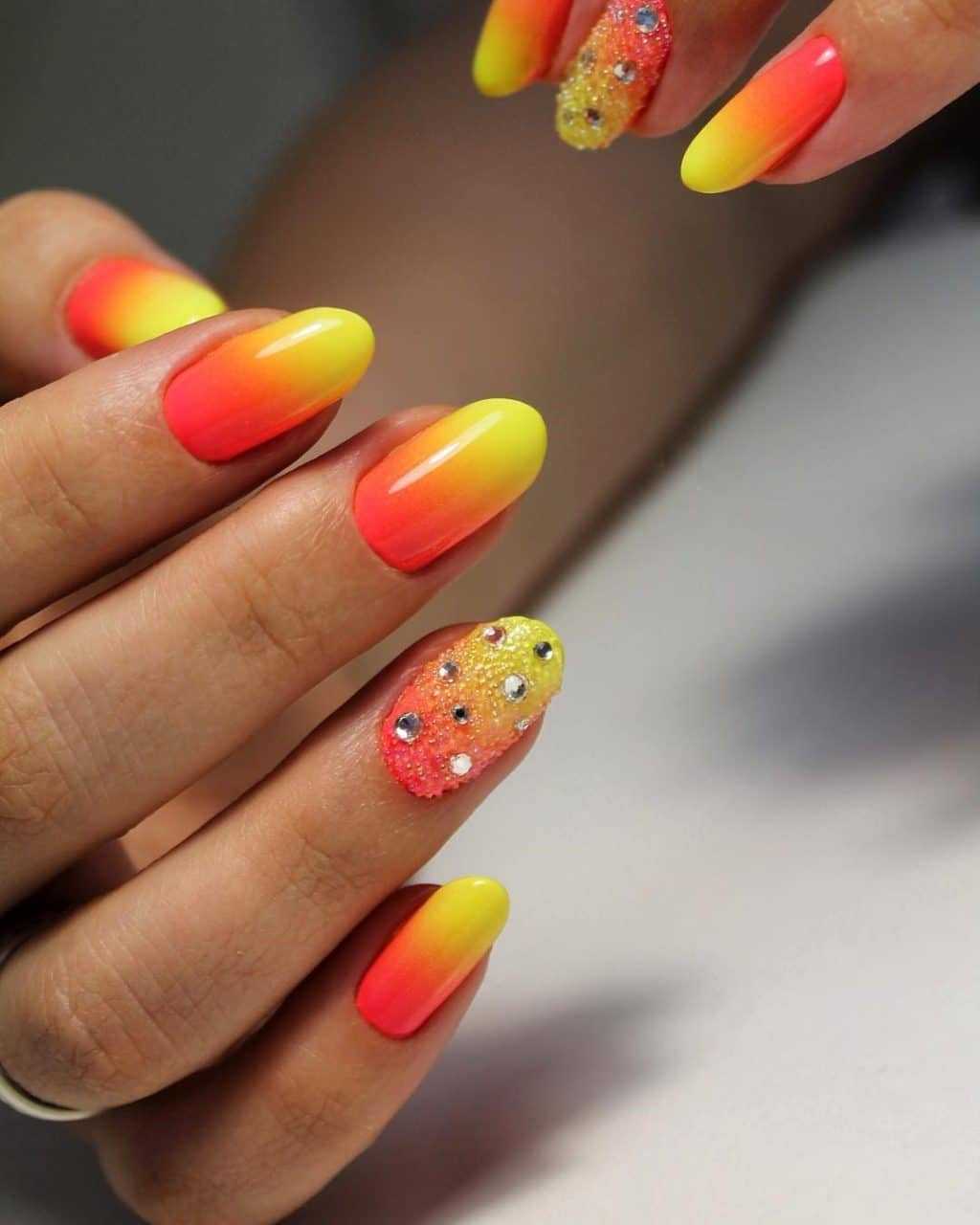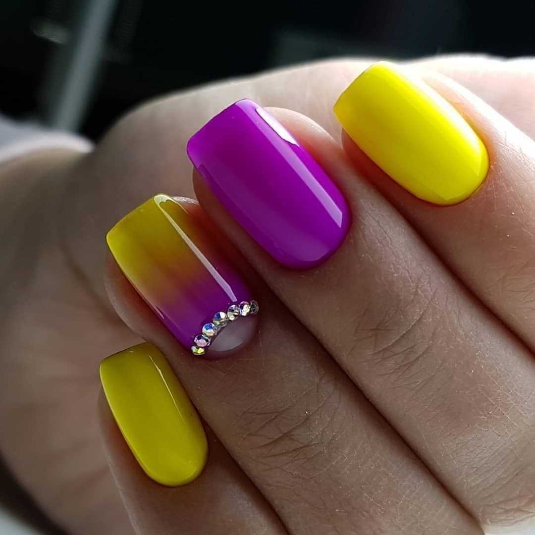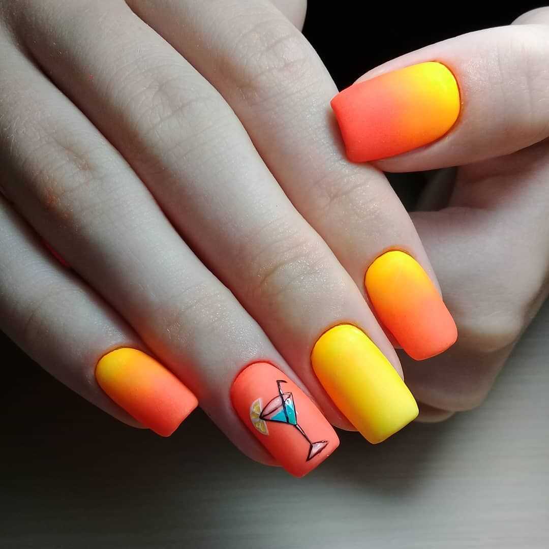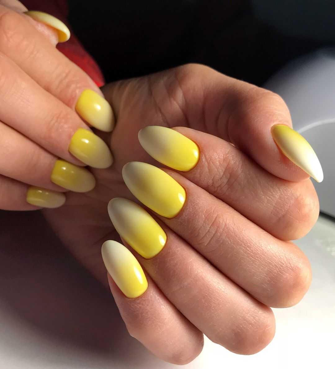 Если слишком яркий желтый цвет вас пугает, то используйте горчичный цвет. Он великолепно смотрится в матовой текстуре в сочетании с дизайном минимализм. Желтый маникюр градиент отлично смотрится на длинных острых, миндальных, квадратных ногтях. На коротких ногтях можно выполнить дизайн с градиентом, бабочками, полевыми цветами и другими узорами. Желтый смотрится легко и не насыщенно, поэтому его без проблем можно сочетать с любыми летними узорами.