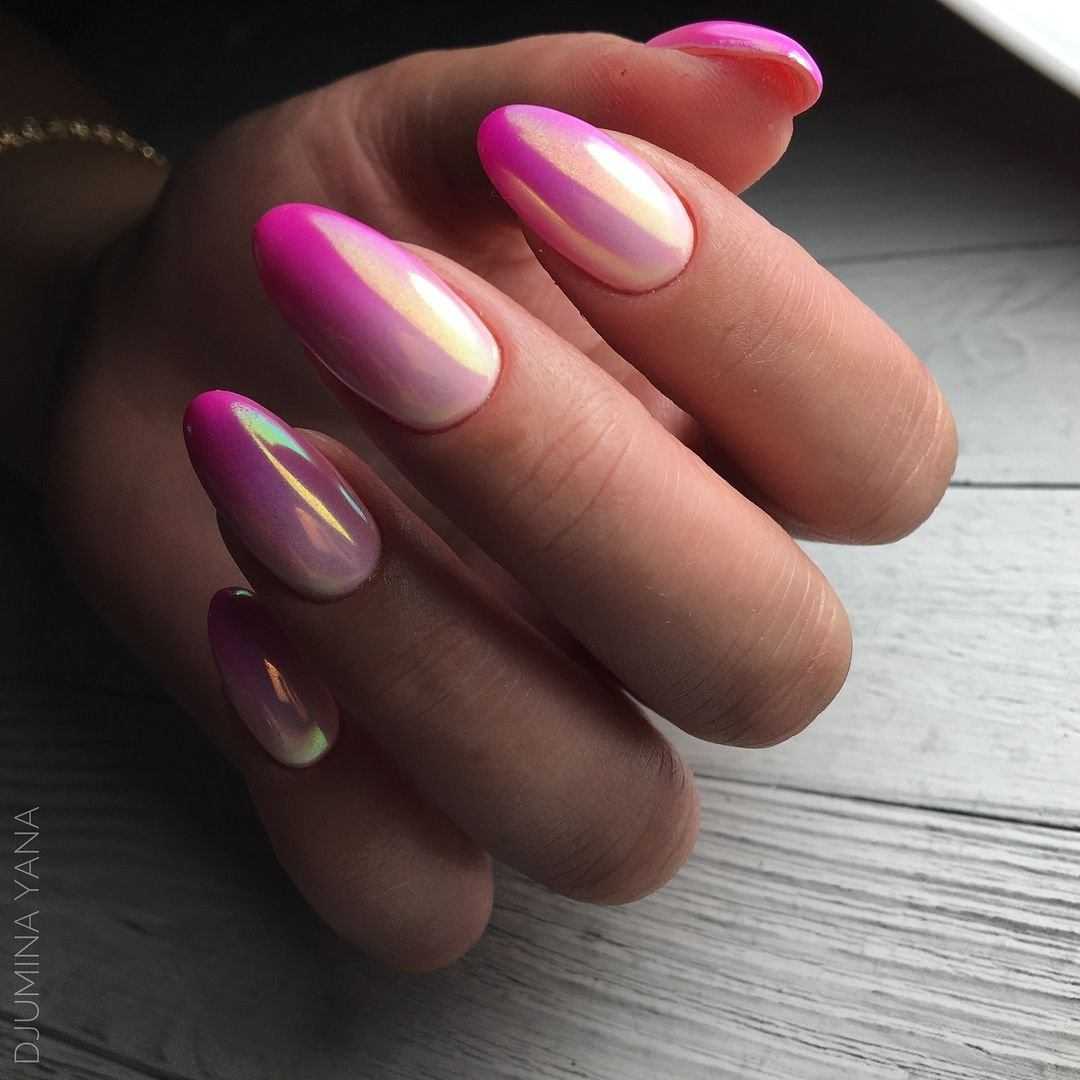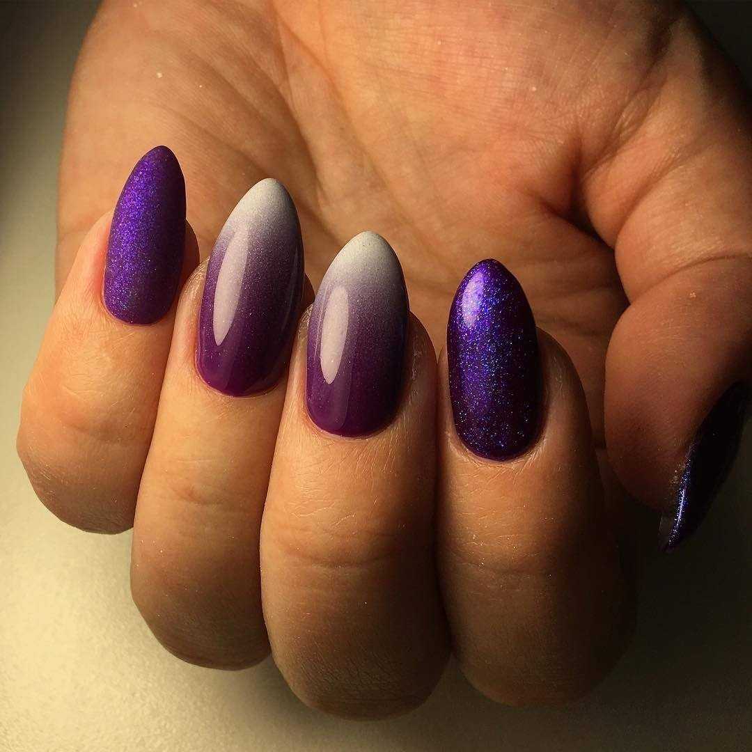Форма миндаль – неизменная классика маникюра. Она отлично сочетается с любым оттенком из фиолетовой палитры – от пастельного до почти чёрного. Особенно эффектные варианты нейл-арта – кошачий глаз, омбре, френч.
