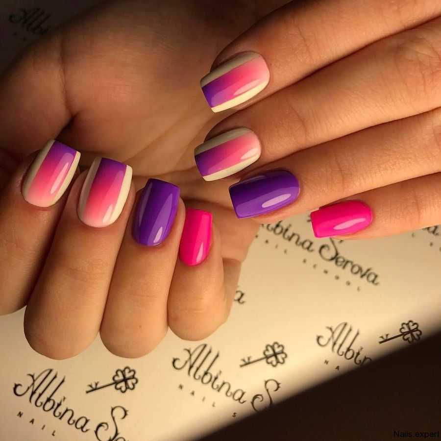 Для визуального удлинения ногтей можно применять интересные приёмы – делать вытянутые геометрические рисунки, наносить узоры поперёк. Прекрасно будет смотреться сиреневый градиент с розовым, оформление в технике разные руки с нюдовым оттенком.
