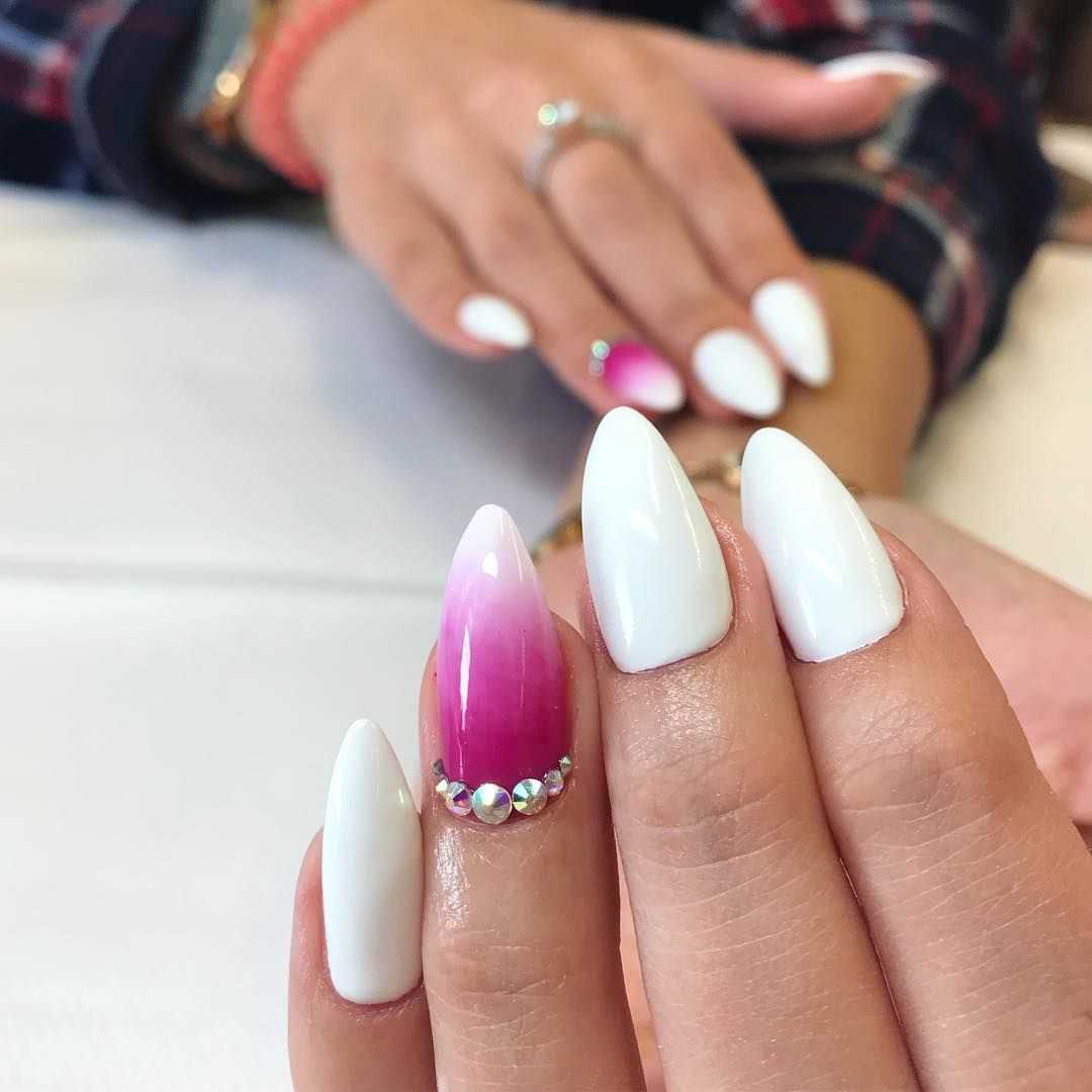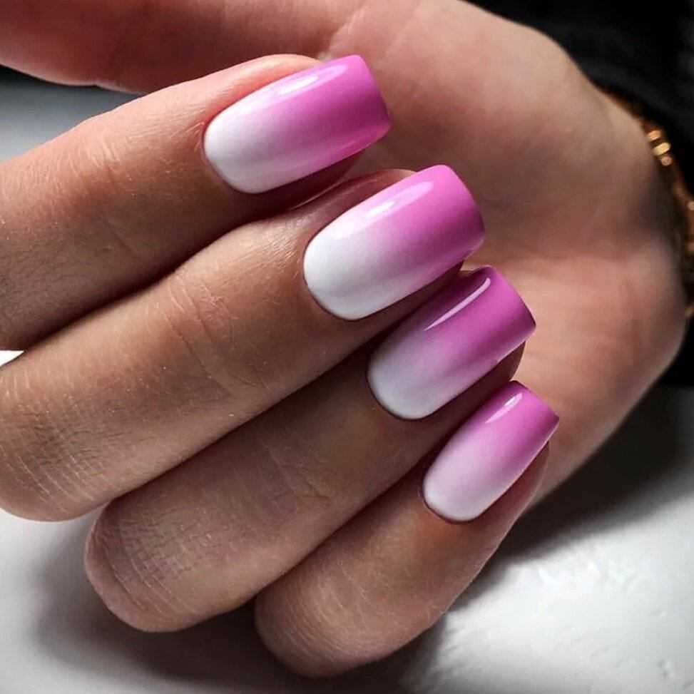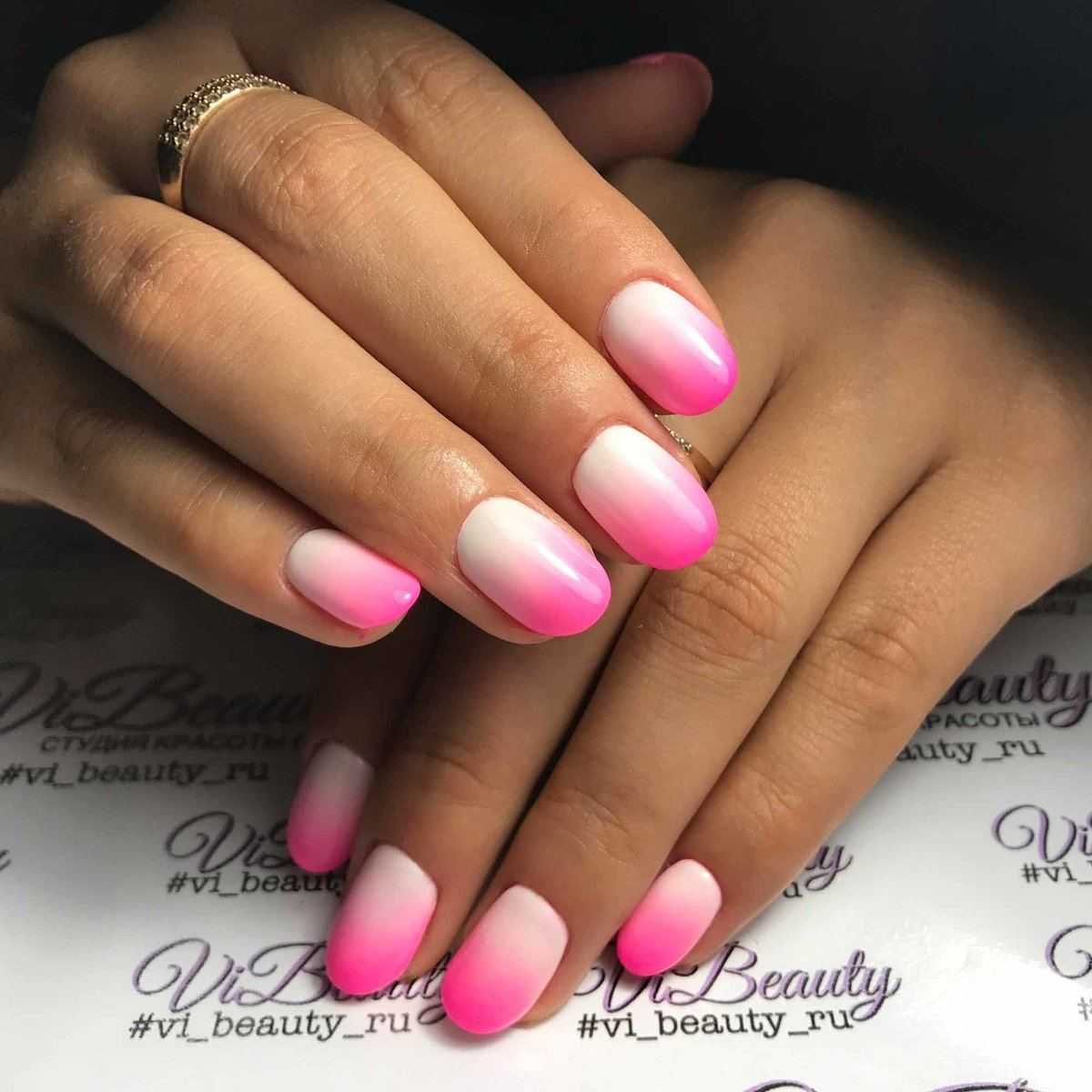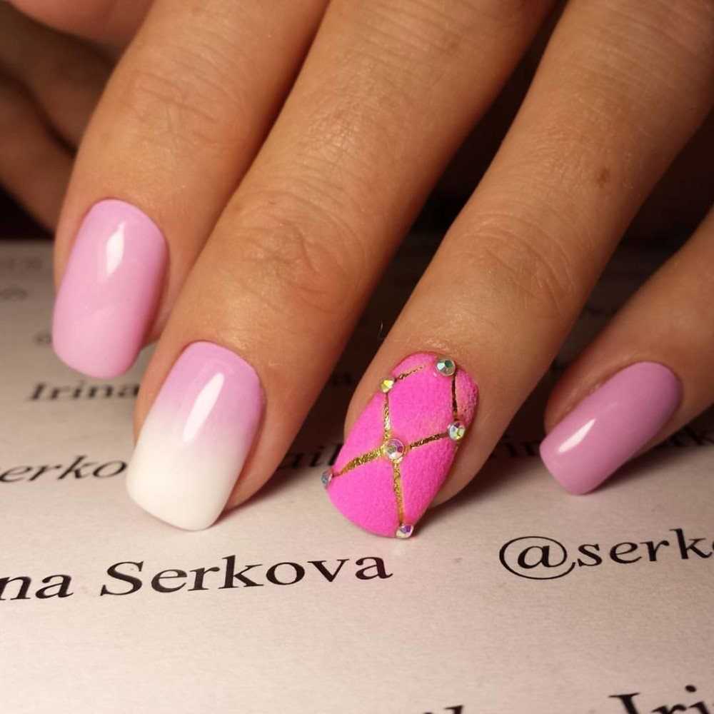 В маникюре омбре розовый цвет чаще всего сочетают с белым. Можно использовать любую технику нанесения узора, но чаще всего выполняется горизонтальный градиент. Розовый цвет можно расположить как по краю ногтя, как и в прикорневой зоне. При желании дополните маникюр прозрачными бульонками, стразами в прикорневой зоне.